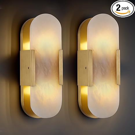 13.8 in Brass Alabaster Wall Sconces, Natural Marble Wall Sconces Set of Two Indoor Alabaster Sconces for Living Room Modern Alabaster Sconces Wall Lighting for Dining Room Stairs Bedroom
