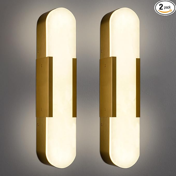 19.7'' Wall Sconces Set of 2, Natural Alabaster Wall Light, Indoor Vanity Light Fixtures for Bathroom, Brass Bedside Wall Lamp Perfect for Hallway, Living Room, Bedroom, Stairs(Gift LED)