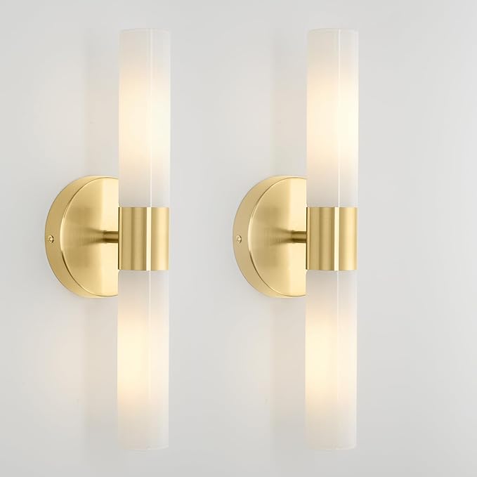 Bathroom Vanity Light Fixtures, Modern Gold Wall Sconces Set of Two, Double Tube Wall Lights Gold Bathroom Lights, Sconces Wall Lighting Wall Mount Fixtures with Opal Glass Tube Shades, E12 Base