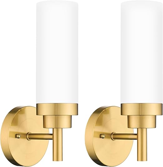 Emak Wall Sconces Set of 2, Modern Brushed Gold Bathroom Vanity Sconce Wall Lighting with Milk Glass Shade for Bathroom, Bedroom, Living Room, Hallway, WS085-BGD-ML-2PK