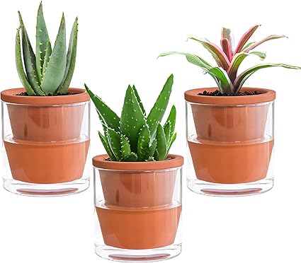 D'vine Dev 4 Inch Design Self Watering Pot for Indoor Plants, Terracotta Planter with Cylinder Glass Cup, Set of 3, 37-X-A-3