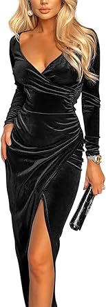 ZileZile Women's Sexy Long Sleeve Ruched Dress Velvet V Neck Cocktail Party Evening Club Maxi Dress