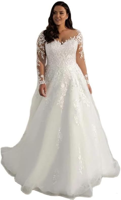 Women's Plus Size Lace Wedding Dresses for Bride Long Tulle Wedding Dress A Line