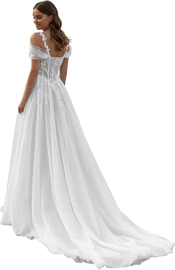 Lace Applique Wedding Dresses for Brides 2024 Spaghetti Strap V Neck Long Tulle Bridal Gown for Women
