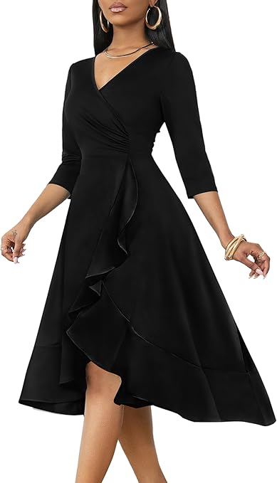 Nmoder Women's Formal Dresses Wedding Guest Cocktail Party Midi Dress Ruffle 3/4 Sleeve V-Neck Modest High Low Dress