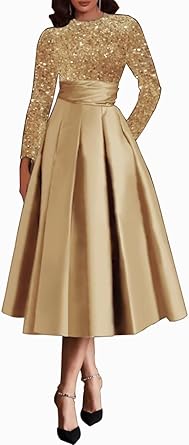 Women's Long Sleeve Mother of The Bride Dresses with Pockets Sequin Prom Dresses Satin A Line Formal Dresses