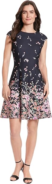 London Times Women's Dresses Floral Border Cap Sleeve Fit & Flare Dress