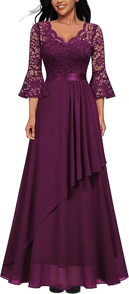 MISSMAY Women's Elegant V-Neck Floral Lace Bell Sleeve Wedding Party Maxi Dress