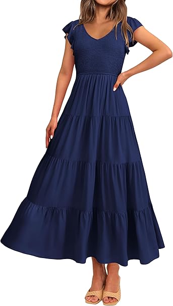 MASCOMODA Womens Summer Maxi Dress Casual V Neck Cap Sleeve Smocked Dresses Ruffle Tiered Beach Party Long Flowy Sundresses