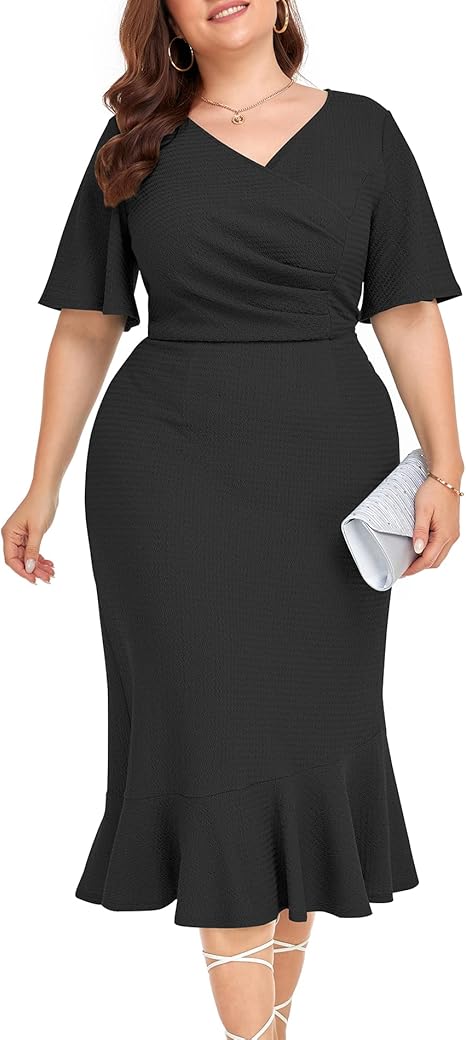 LALAGEN Plus Size Dress for Women Modest Short Sleeve Ruched Bodycon Mermaid Cocktail Midi Dresses 1X-6X