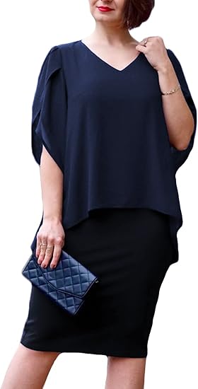 LIDLIT Womens Plus Size Chiffon Cocktail Dress V Neck Overlay Ruffle 3/4 Sleeve Wedding Guest Party Dresses