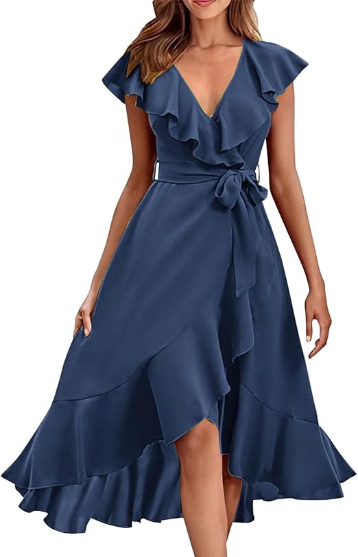 Womens Summer Wrap V Neck Split Party Dress Ruffle Short Sleeve Midi Dress with Belt