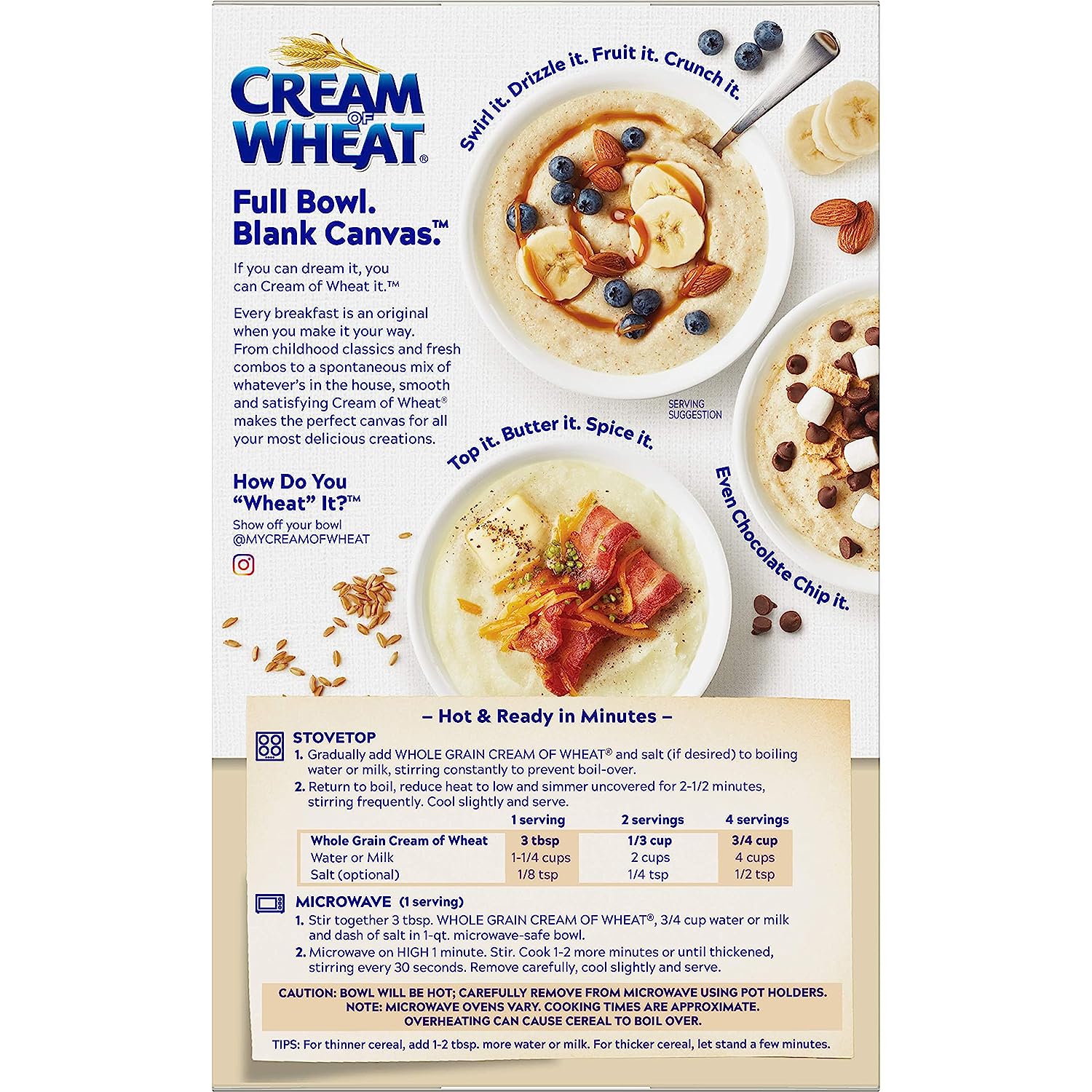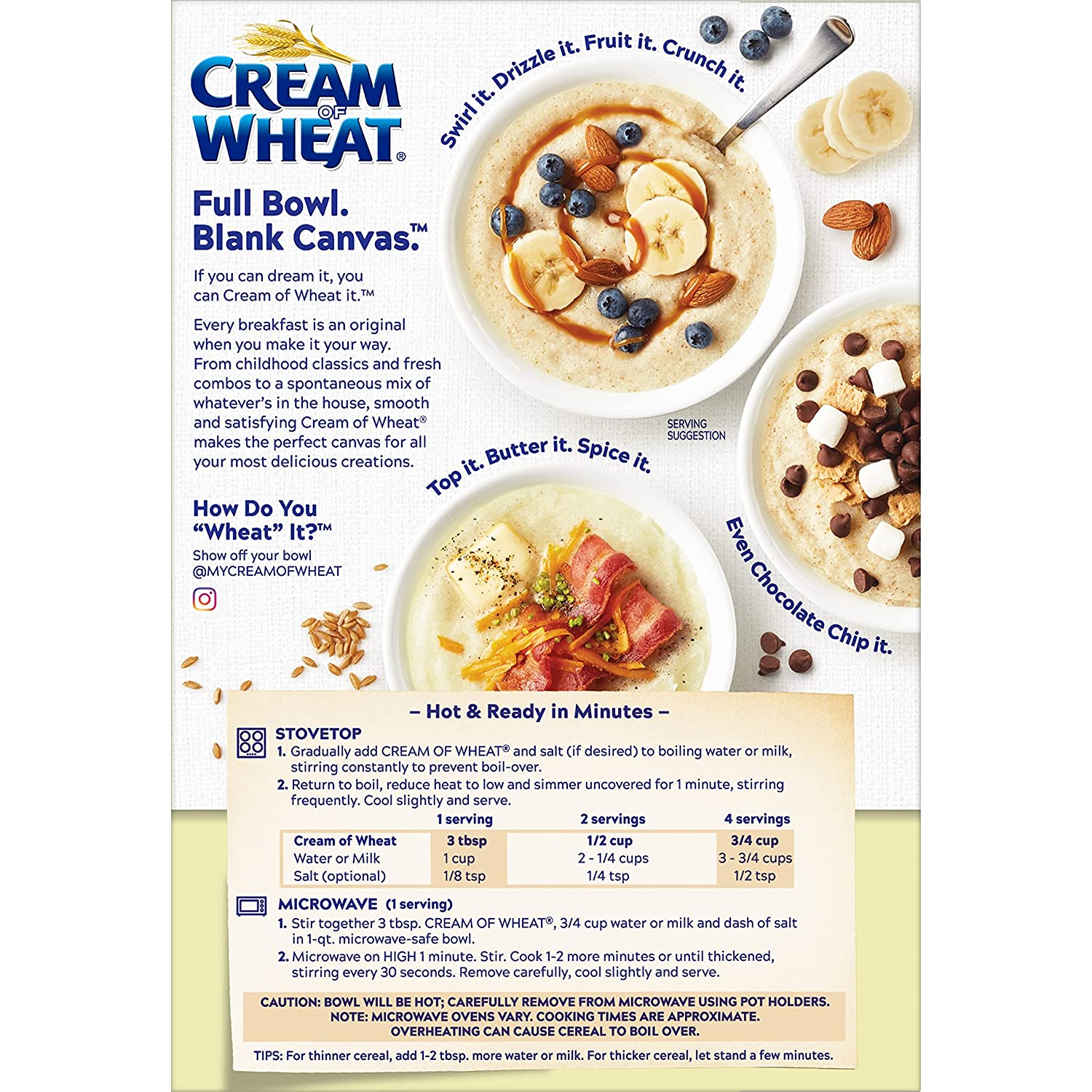 Today, the very same products with the same energizing nutrients are bringing back those warm memories of playing outside and loving life in the most simple way. Through the years, we’ve been rekindling the happiest times, through the very same basic recipe, and our oldest secret ingredient: home. Take a closer look at our entire family of Cream of Wheat products. Our flavors will satisfy any craving, mood, or schedule. From stove-top simmered to out-of-the-microwave in minutes, find the one that’s just right for you! Cream of Wheat Original Enriched Farina is made with ground wheat, has a smooth texture, and is an excellent source of iron and calcium. The traditional cook-on-stove product is prepared by boiling water or milk and slowly pouring in the ground wheat while stirring. Let it simmer while stirring for 2 ½ minutes after the ground wheat is blended. This product may also be cooked using a microwave oven for faster and easier preparation.