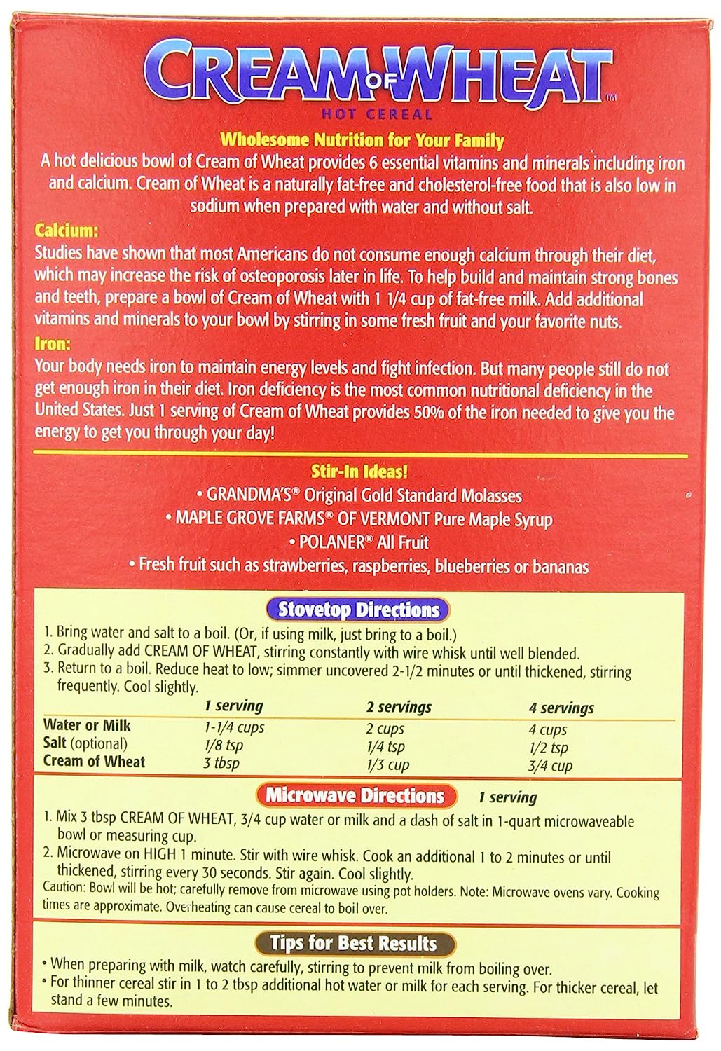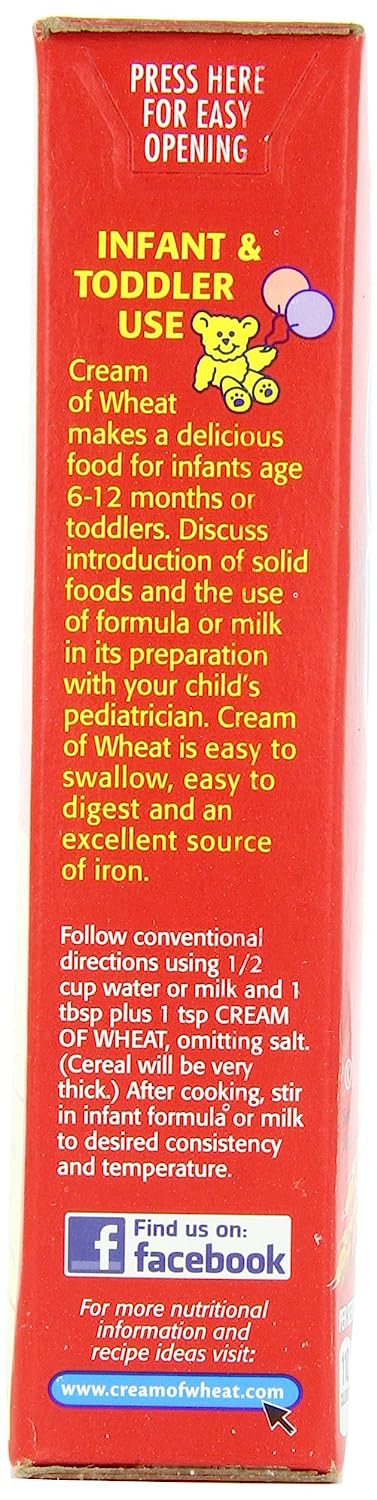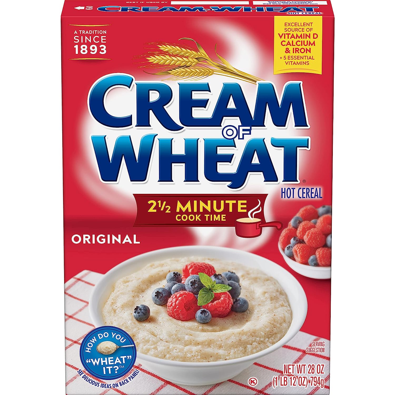Cream of Wheat Original 2.5 minute enriched farina is made with ground wheat and has a smooth texture. The traditional cook on stove product is prepared by boiling water or milk and slowly pouring in the ground wheat while stirring. This variety simmers while stirring for 2 and half minutes after the ground wheat is blended. This product may also be cooked using a microwave oven for faster and easier preparation. Throughout the years, cream of wheat has maintained its position as one of the nation’s leading hot breakfast cereals. Original, cook on stove cream of wheat is the same nutritious product that has been a standby in homes for over 90 years. Instant varieties of cream of wheat were gradually added, providing consumers on the run a healthful, hot breakfast.