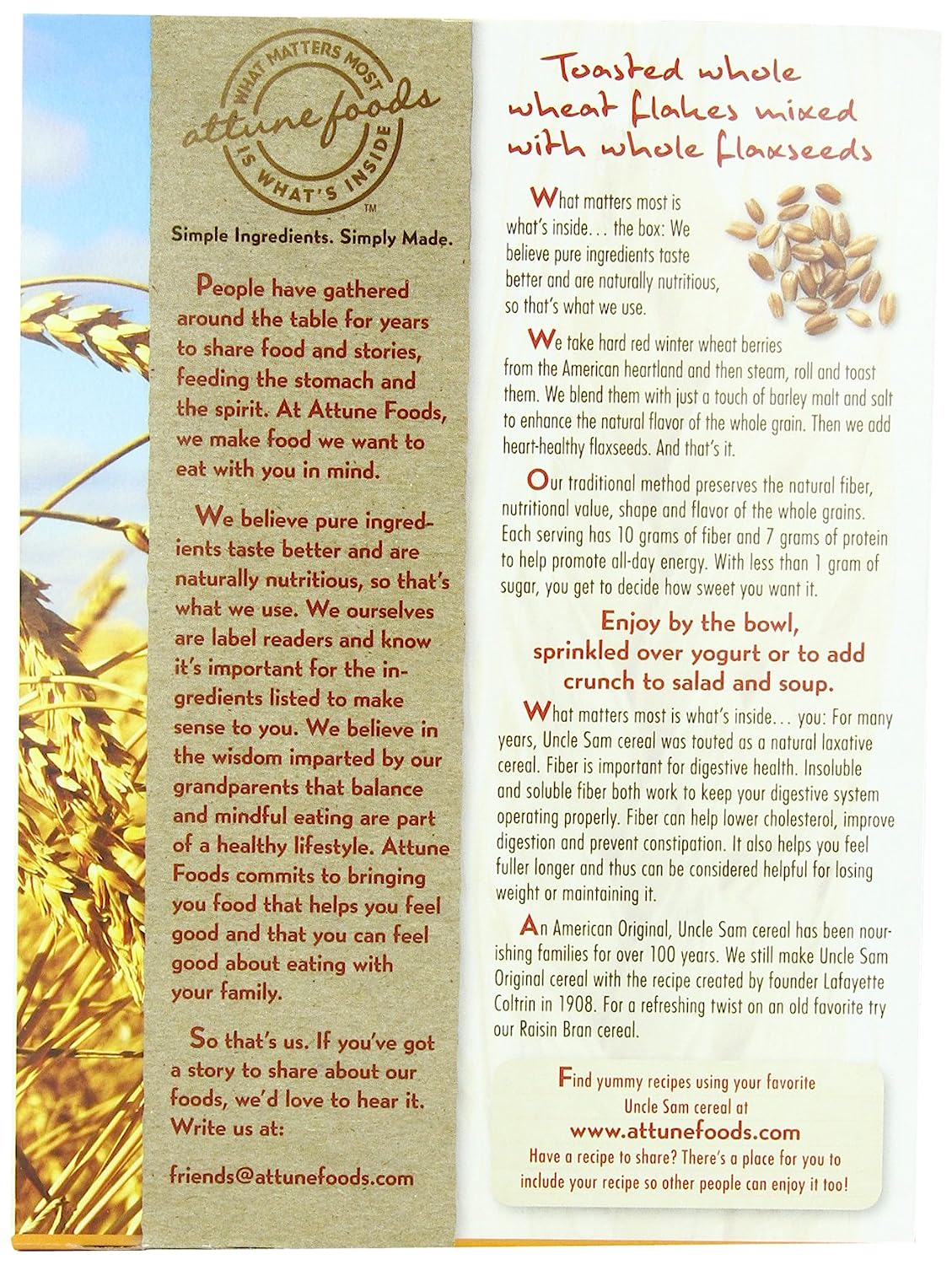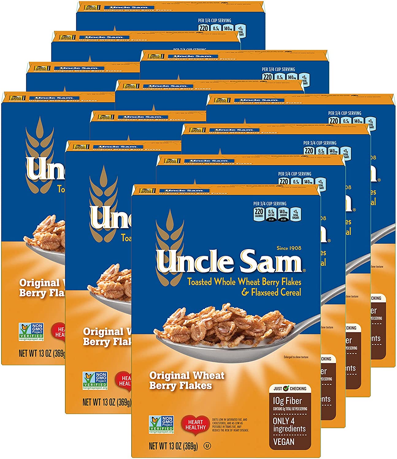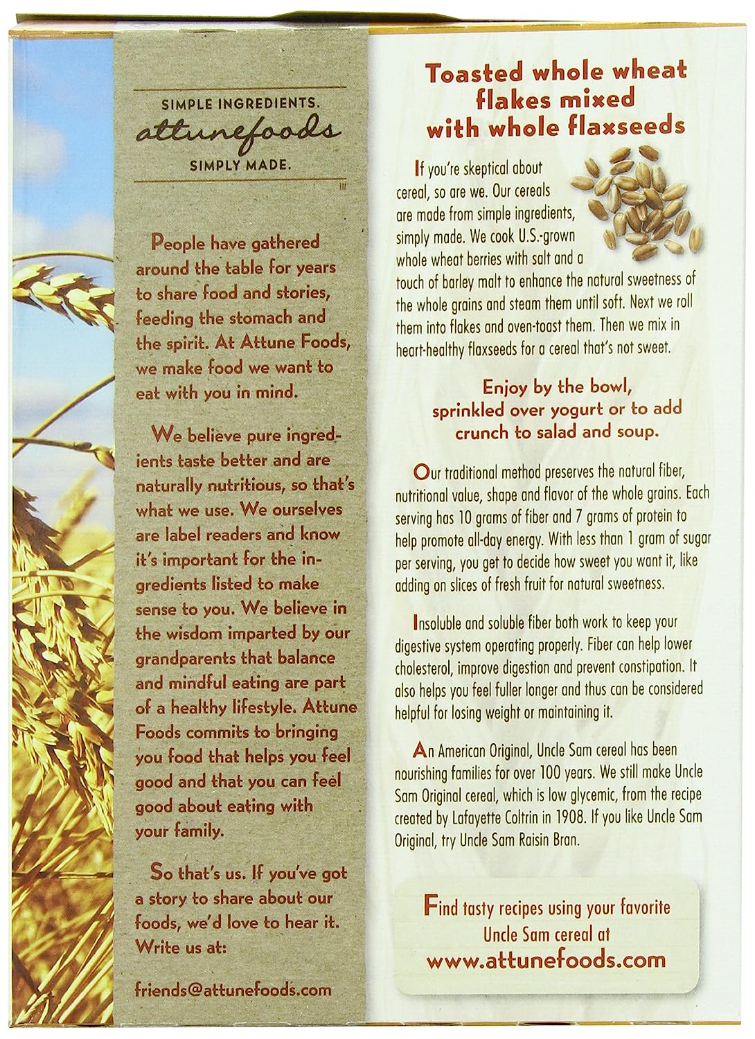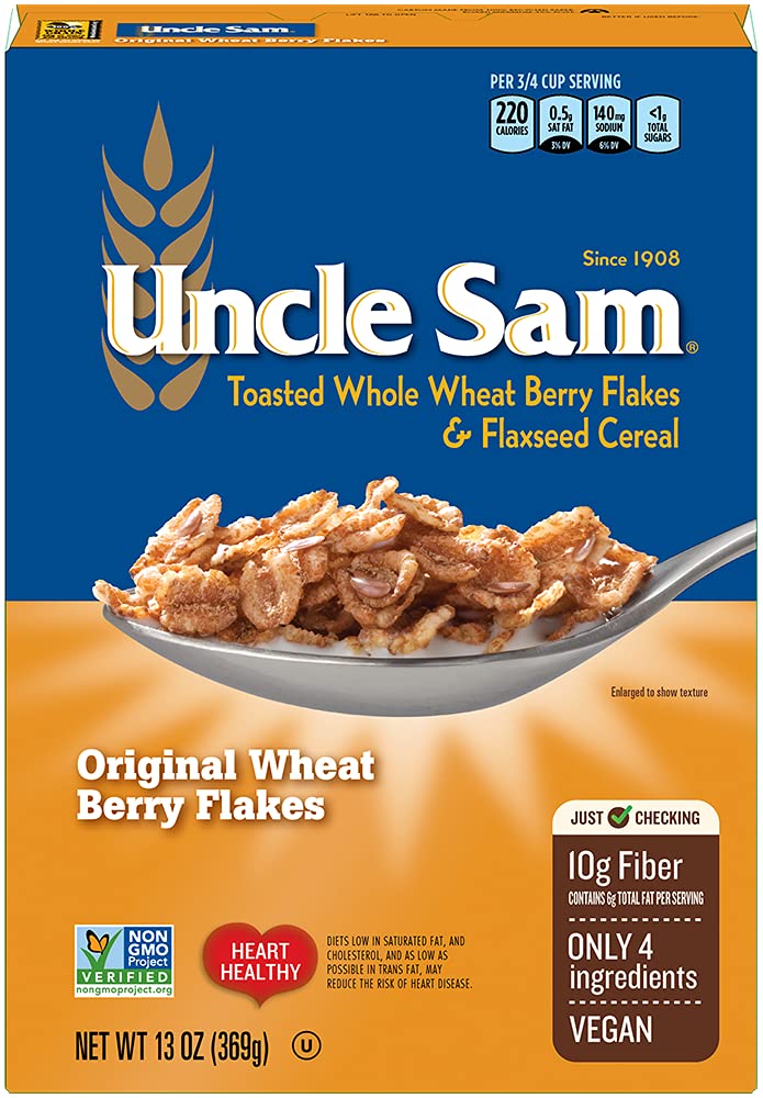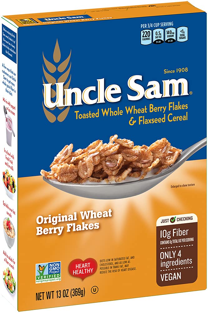 An American Original since 1908, Uncle Sam high fiber cereal has nourished families for over 100 years! Hard red winter wheat berries with flaxseeds make this a wholesome high fiber cereal. Stay fit, full & feeling your best with Uncle Sam.