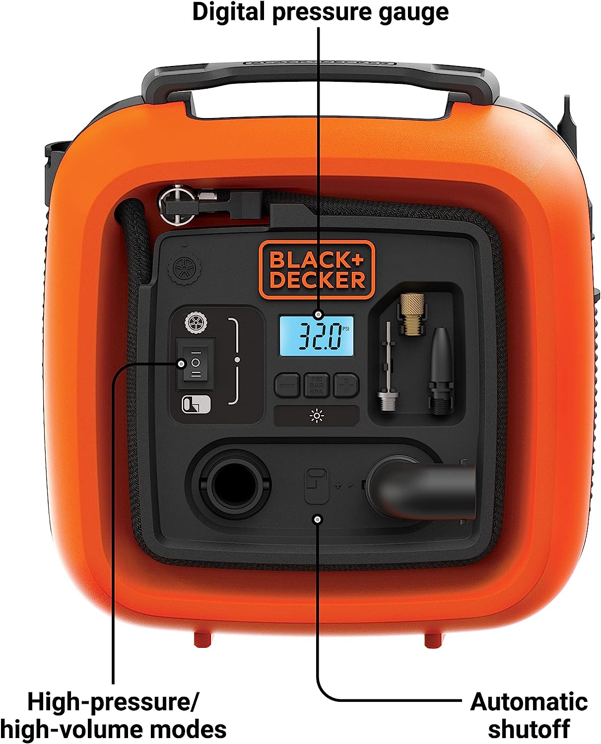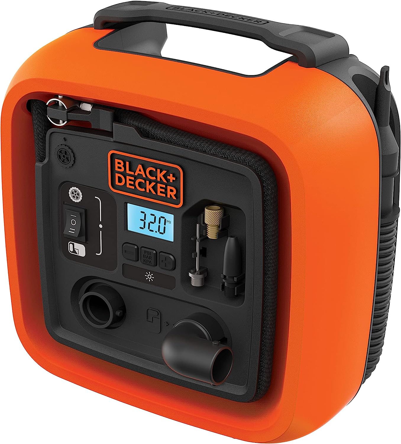 With the versatile BLACK+DECKER 12V DC multipurpose tire inflator, you’ll be able to quickly inflate vehicle and bike tires, rafts and air mattresses, sports balls, and more. This inflator is ready for both high-volume and high-pressure output applications, while the deflate function comes in handy during cleanup and pack-up time. It’s also designed with a digital gauge that shows the current pressure and lets you set the target pressure. Plus, automatic shutoff technology takes the guesswork out of inflating items for added peace of mind. You can even bring this multipurpose inflator on the road with you— just plug it into your vehicle’s lighter socket via the 12V DC adapter.