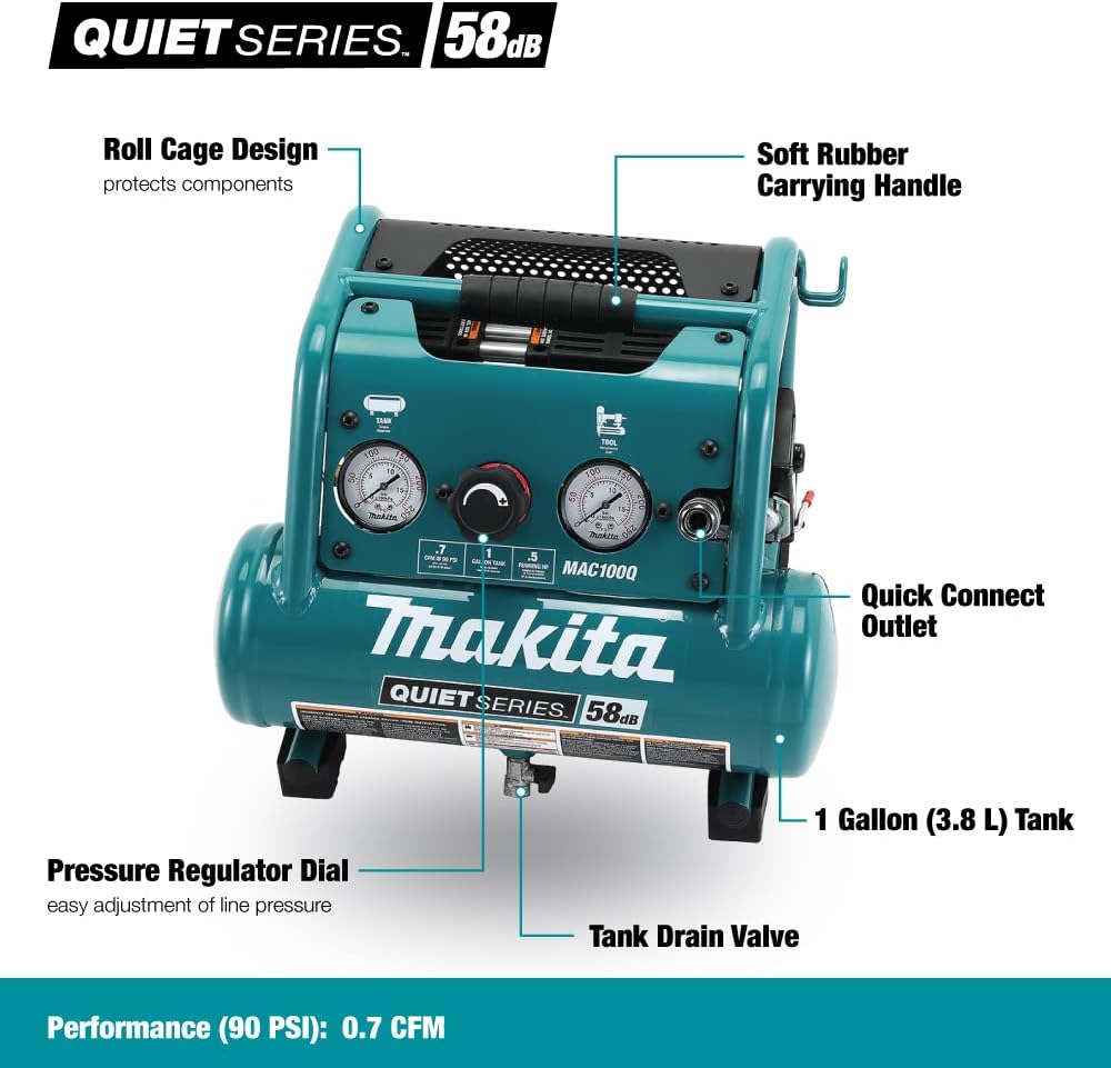 Makita MAC100Q Quiet Series, 1/2 HP, 1 Gallon Compact, Oil-Free, Electric Air Compressor