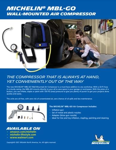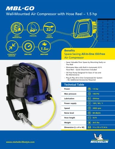 MICHELIN MBL-GO 1.5 HP 120 Volt Wall Mount Air Compressor with a 32' Built in Retractable Hose 130 PSI