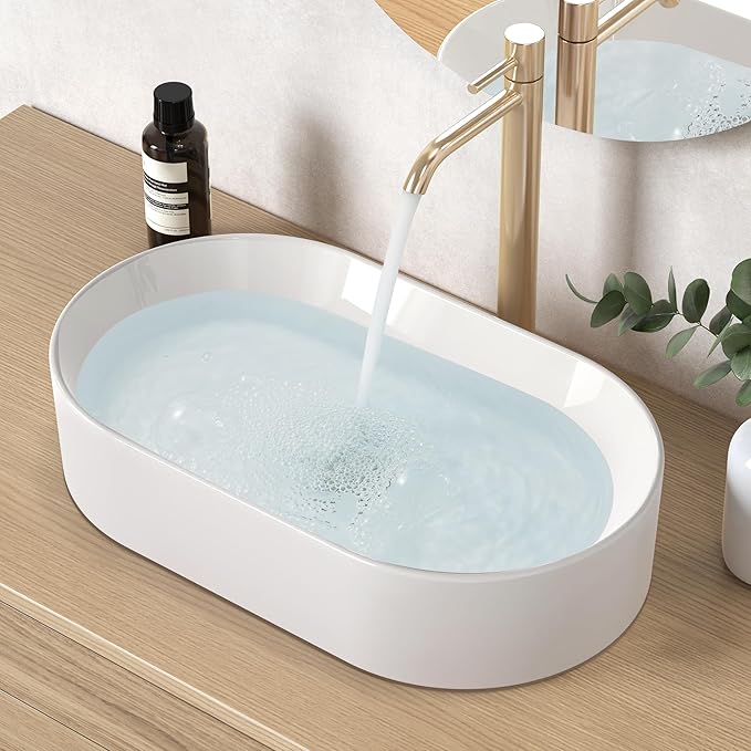 KES Bathroom Sink, White Vessel Sink for Bathroom, Oval Above Counter Ceramic Countertop Modern Sink for Cabinet Lavatory Vanity, BVSO126