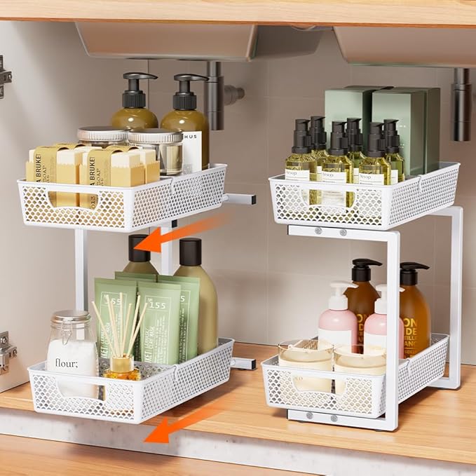 Sotfamily Bathroom Organizers and Storage, Pull Out Cabinet Organizer with Dividers, 2 Tier Under Sink Organizer for Bathroom/Kitchen, 2 Packs, White
