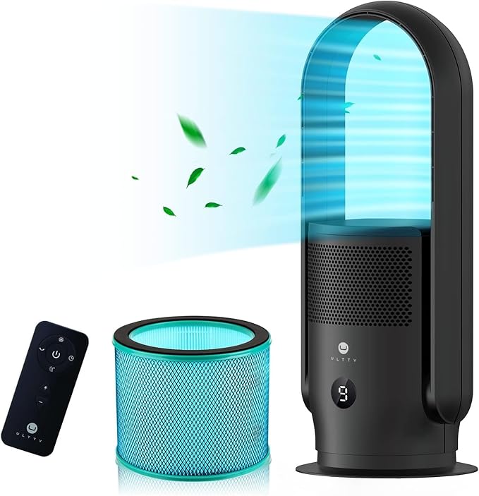 ULTTY Bladeless Tower Fan and Air Purifier in one, 90ŒÁ Oscillating Bladeless Fan with Remote, Touch, 8H Timer, Floor Fans for Bedroom Whole Room Home Office R021, Black