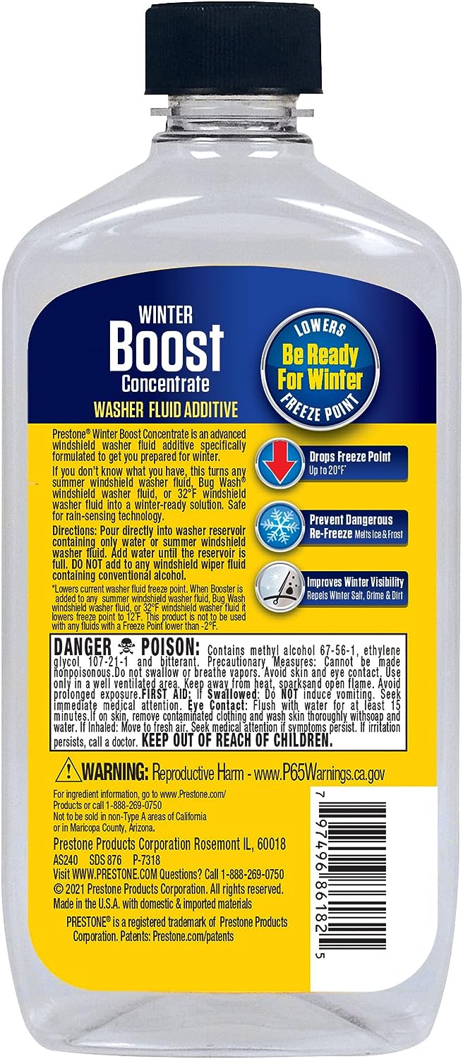 Prestone Windshield Washer Fluid Booster De-Icer Additive improves the melting of light ice and frost when added to ordinary blue washer fluid. This product is a precise blend of ice-melting alcohols that ensures premium performance at even very low temperatures. The robust formula is designed for use with any washer fluid to provide premium performance.