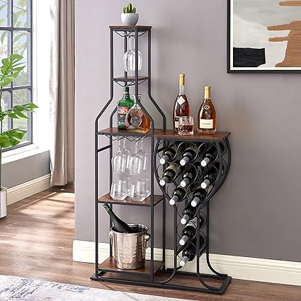 5 Tier Wine Rack Freestanding Floor Cabinet, Mini Bar Table with 6 Glass Holder - 11 Bottles Liquor Stand Display with Storage Shelves-Rustic Brown Small Whiskey Storage for Living Room Kitchen