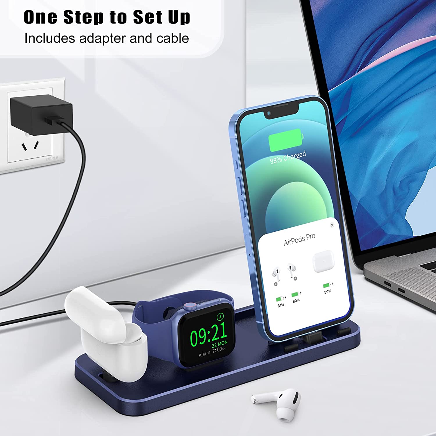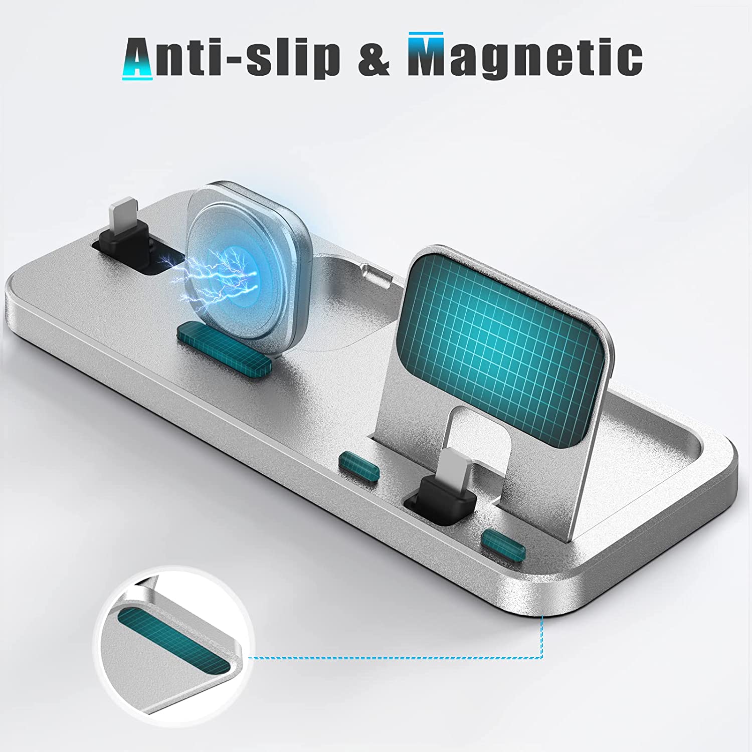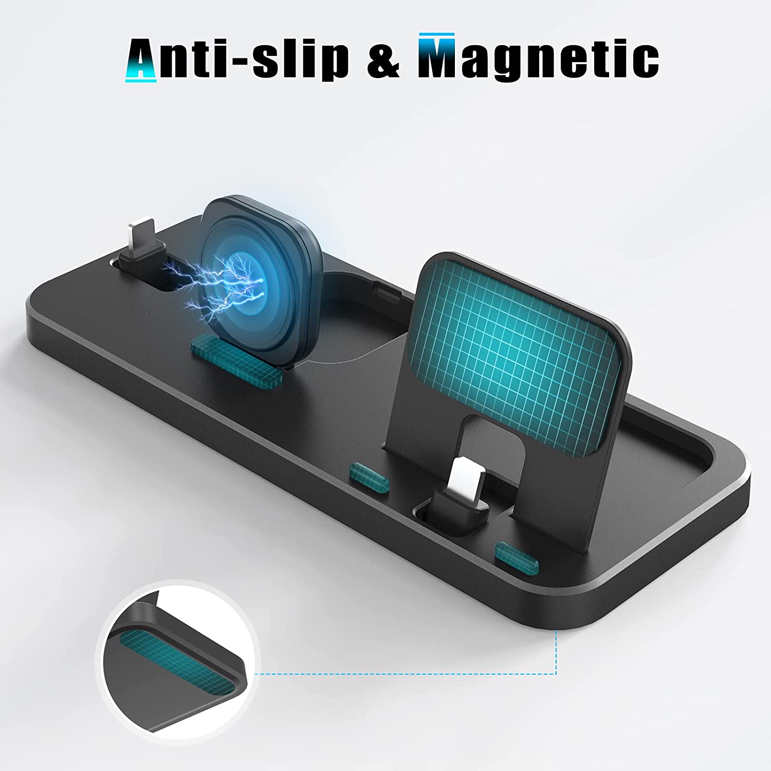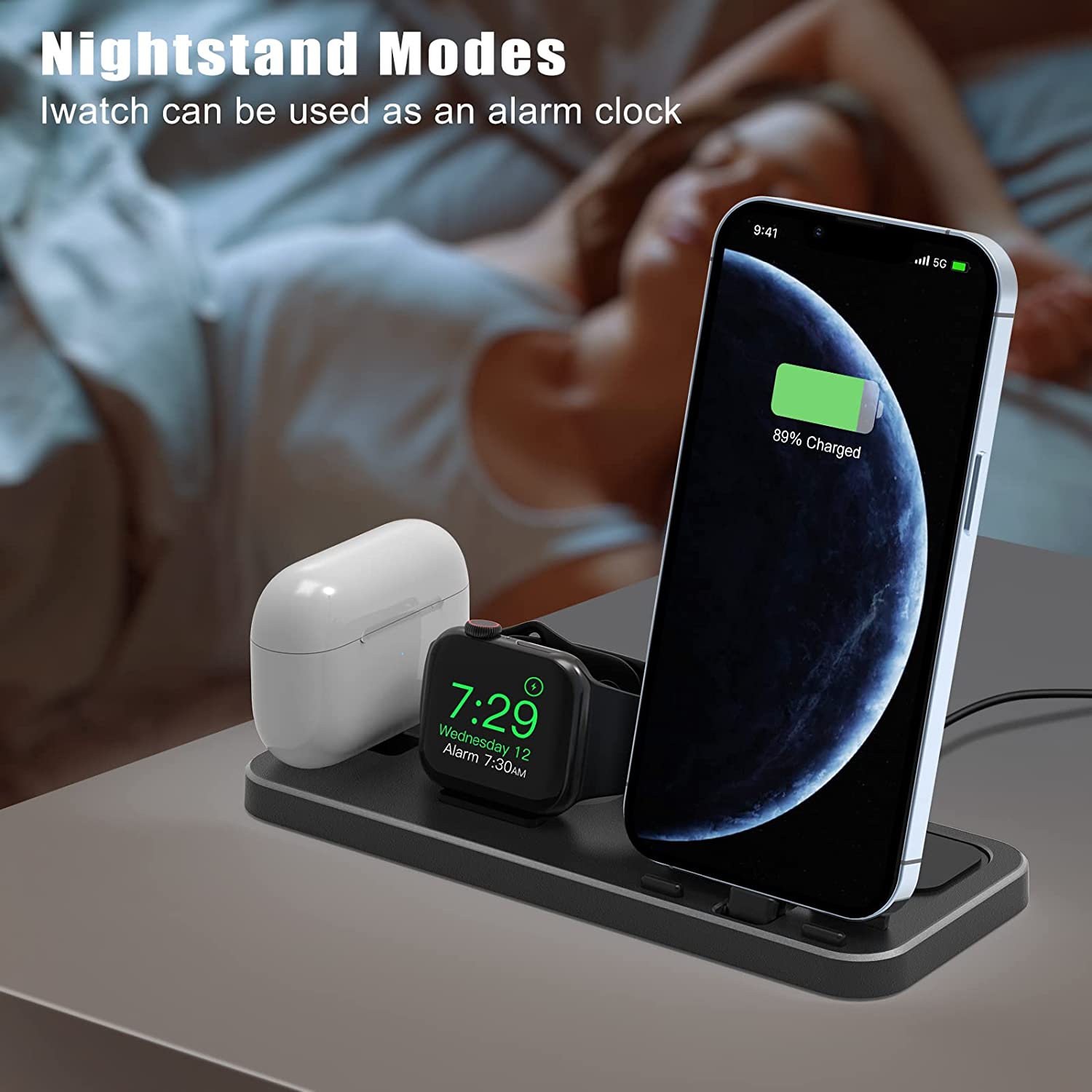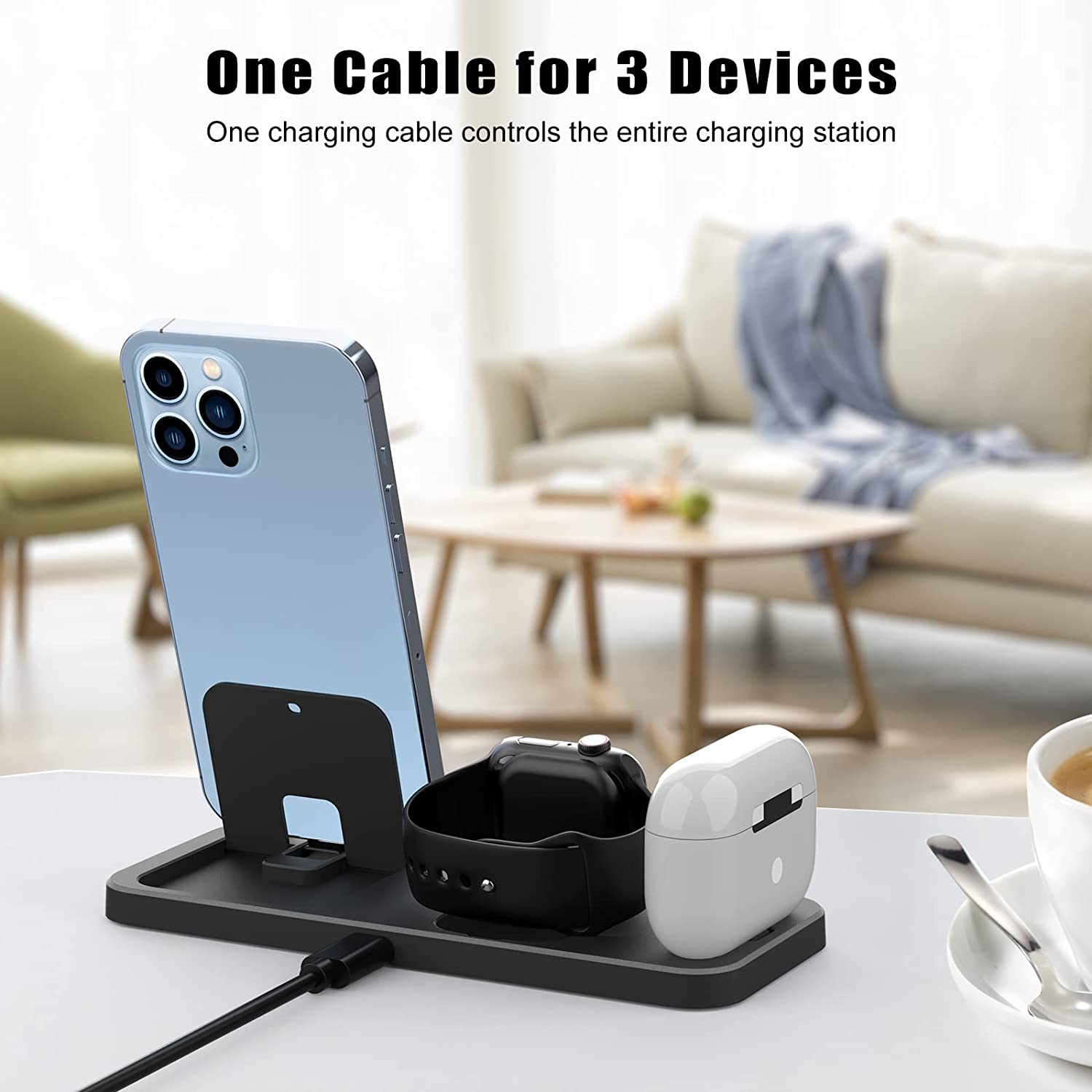 • 【Anti-slip and Magnetic】- 3 in 1 charging station for apple provides magnetic charging for iWatch. Provide built-in charger plugs for iPhone and AirPods. The bottom of the charger, the phone holder and the bottom of the iwatch are designed with non-slip silicone pads to make your device safer.