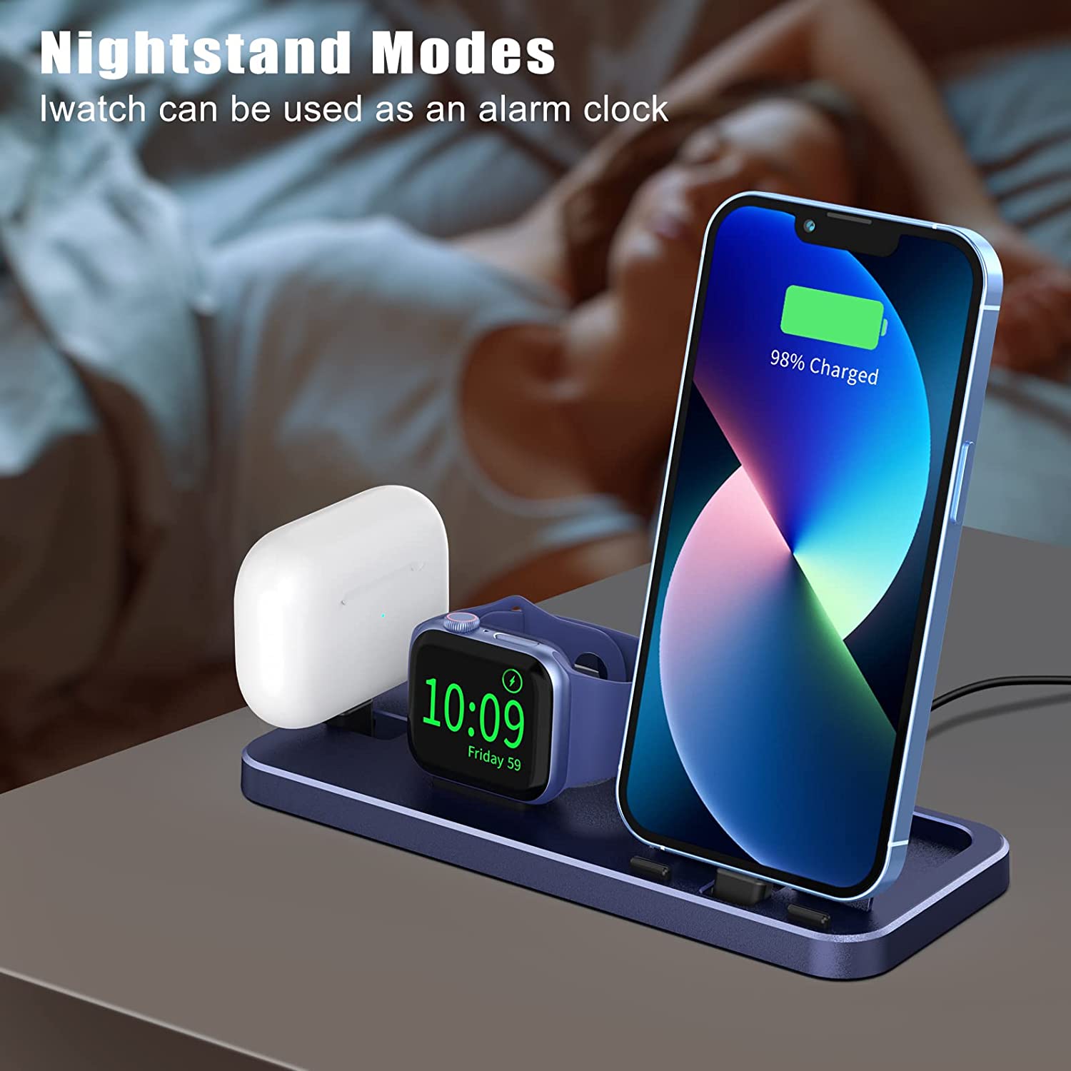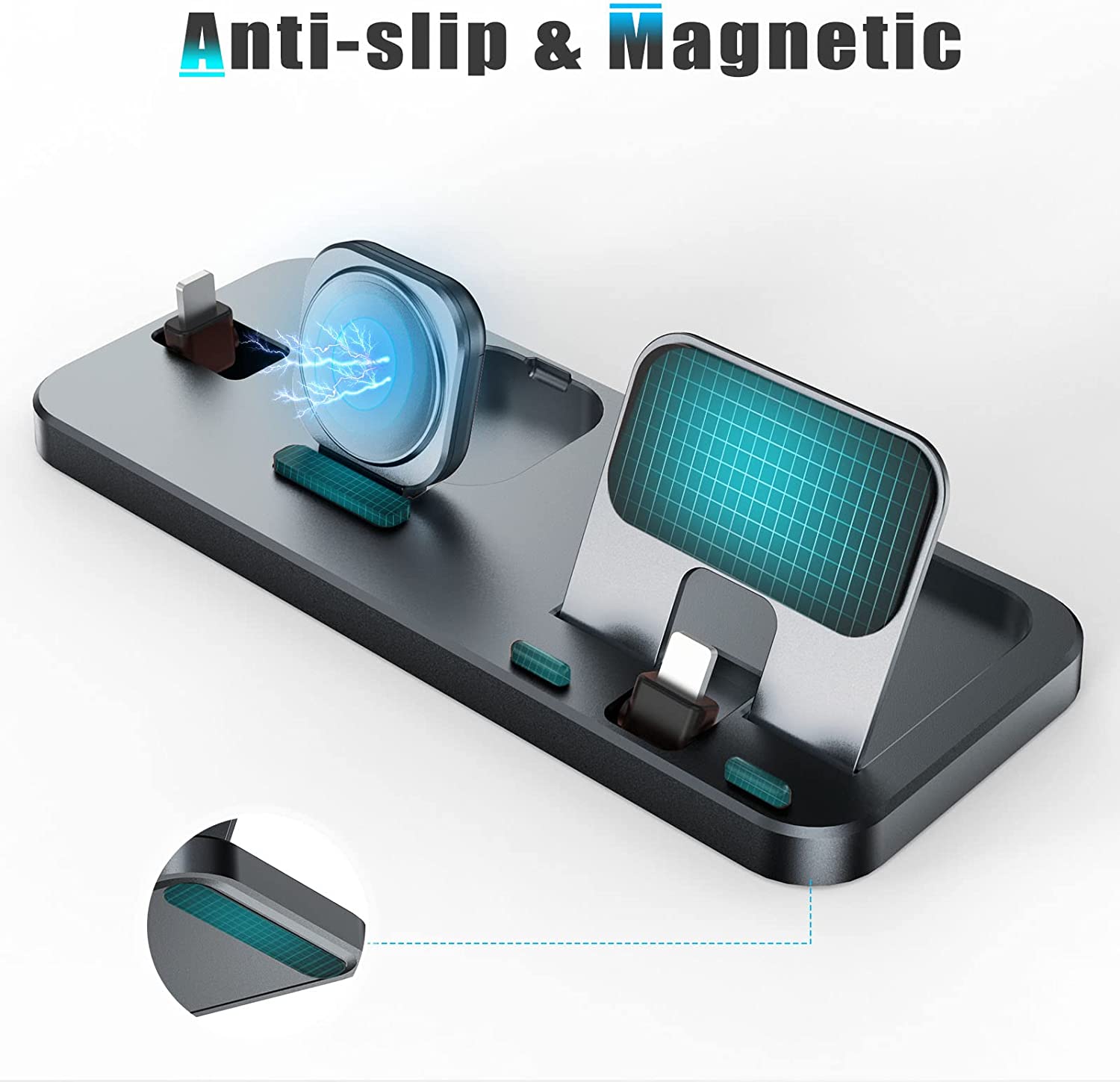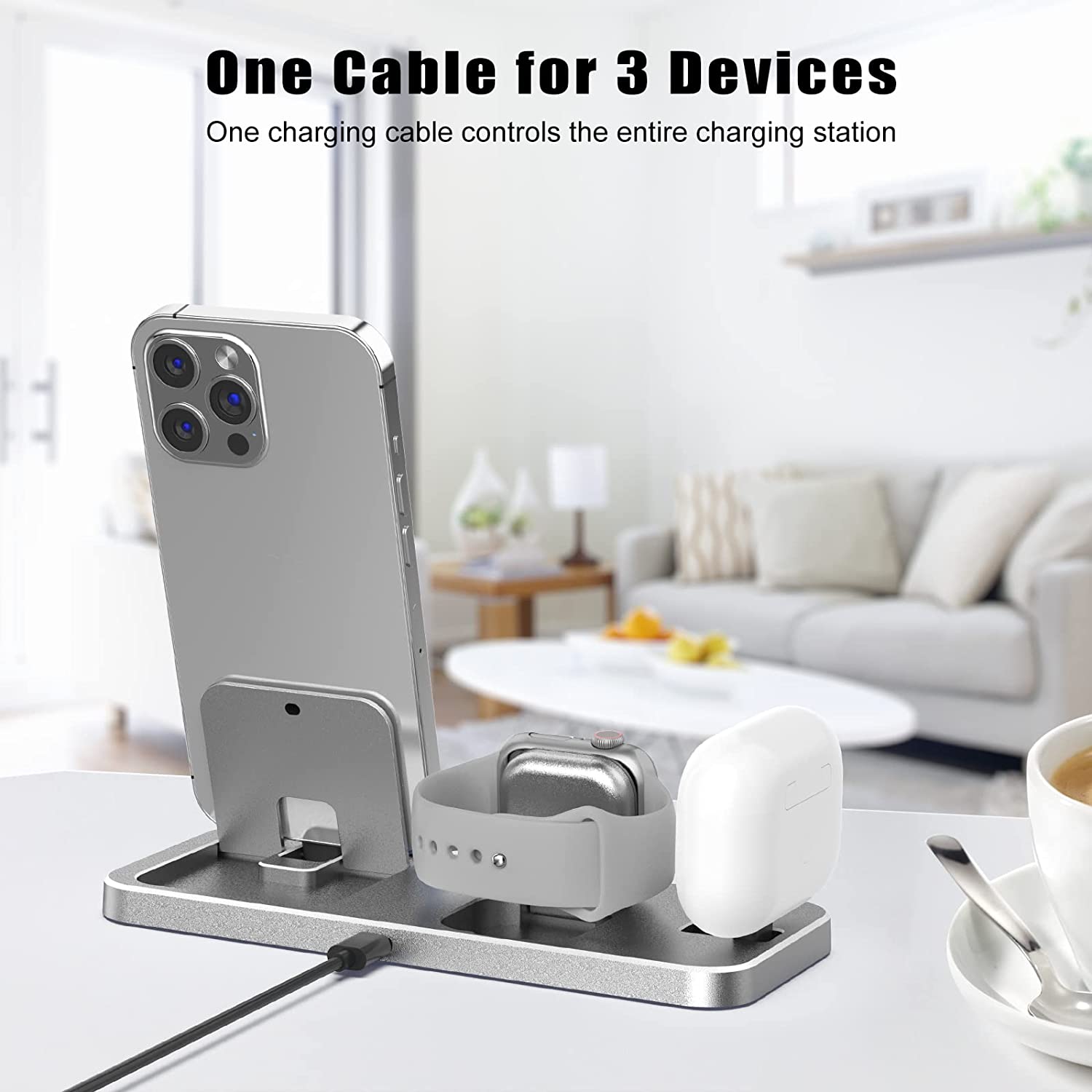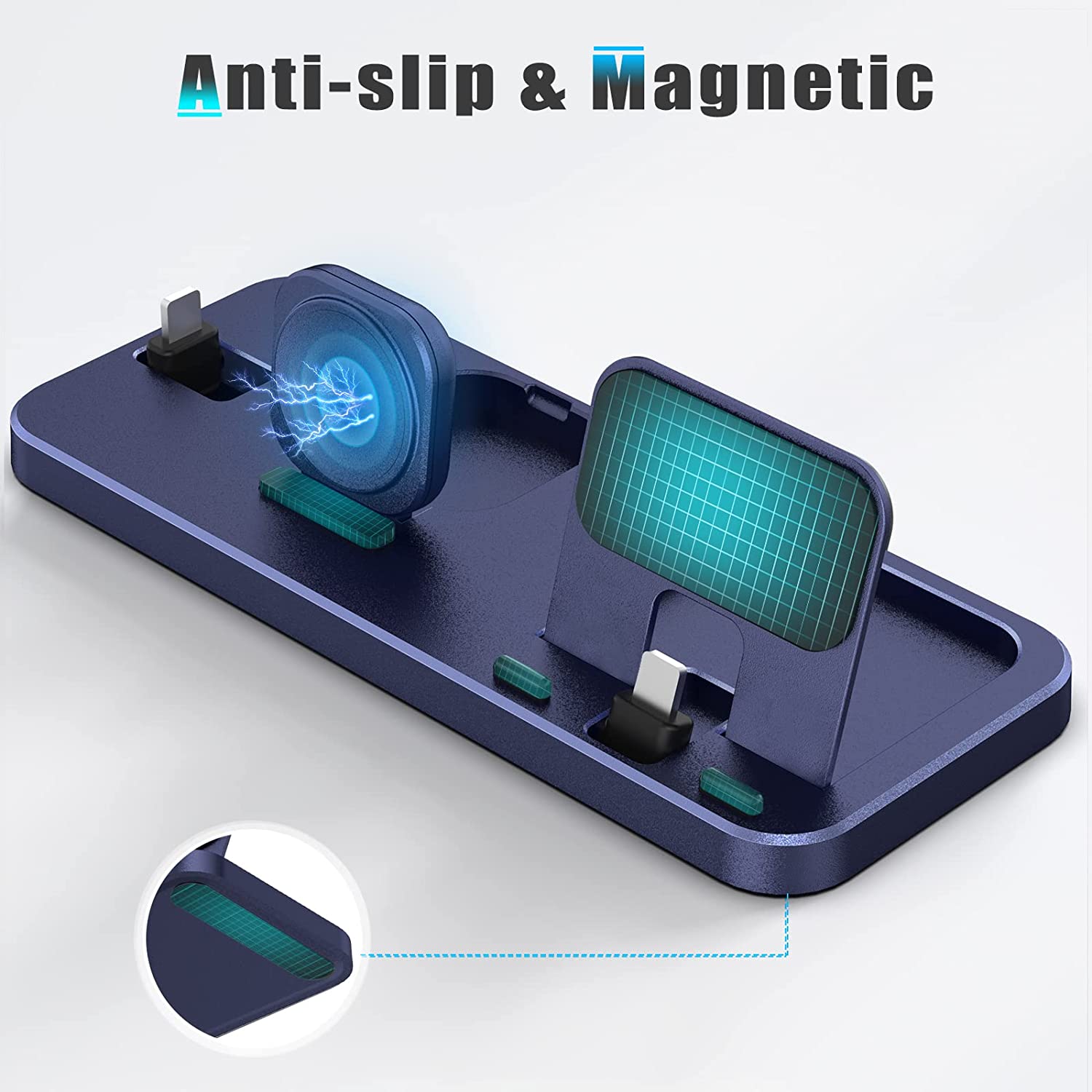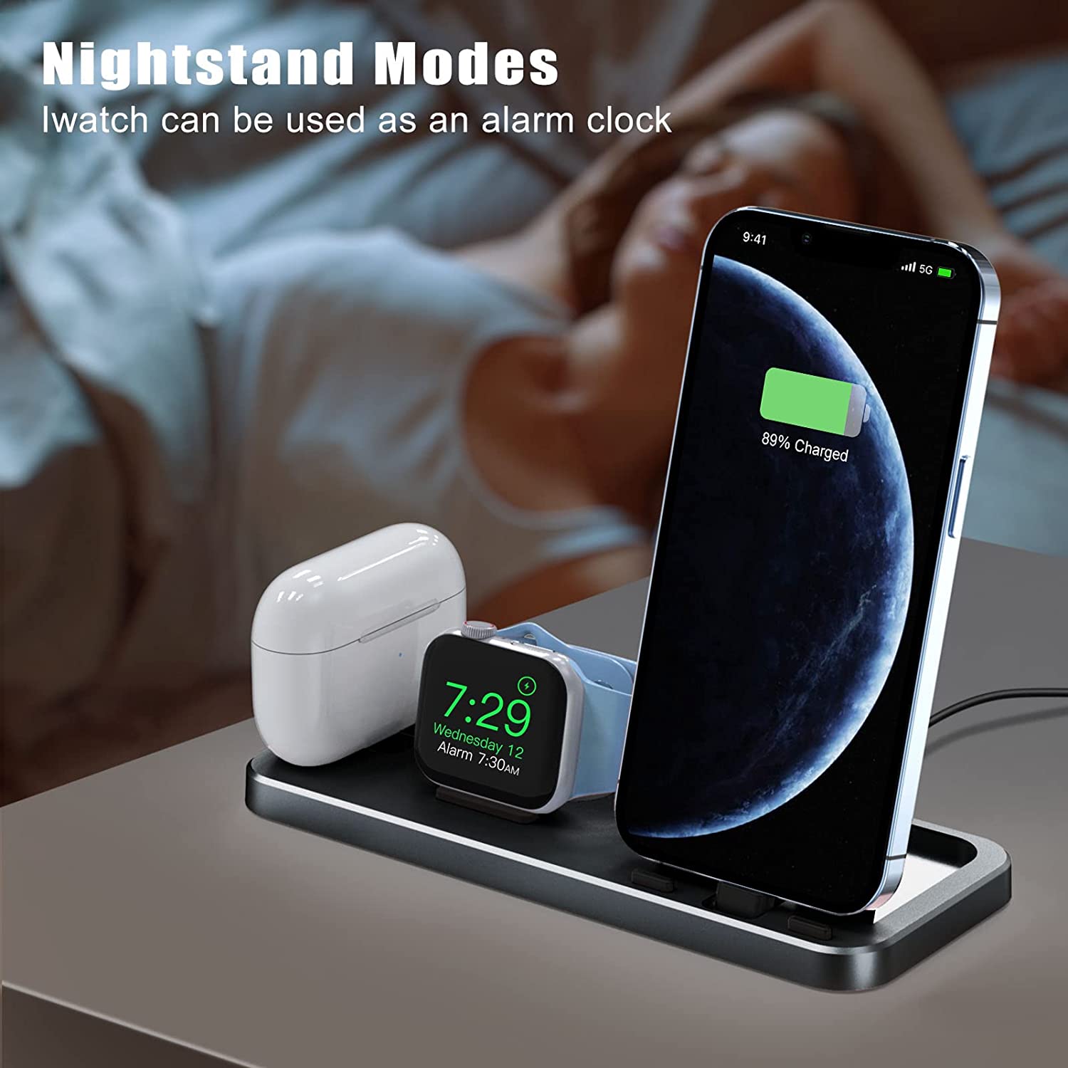 • 【Anti-slip and Magnetic】- 3 in 1 charging station for apple provides magnetic charging for iWatch. Provide built-in charger plugs for iPhone and AirPods. The bottom of the charger, the phone holder and the bottom of the iwatch are designed with non-slip silicone pads to make your device safer.