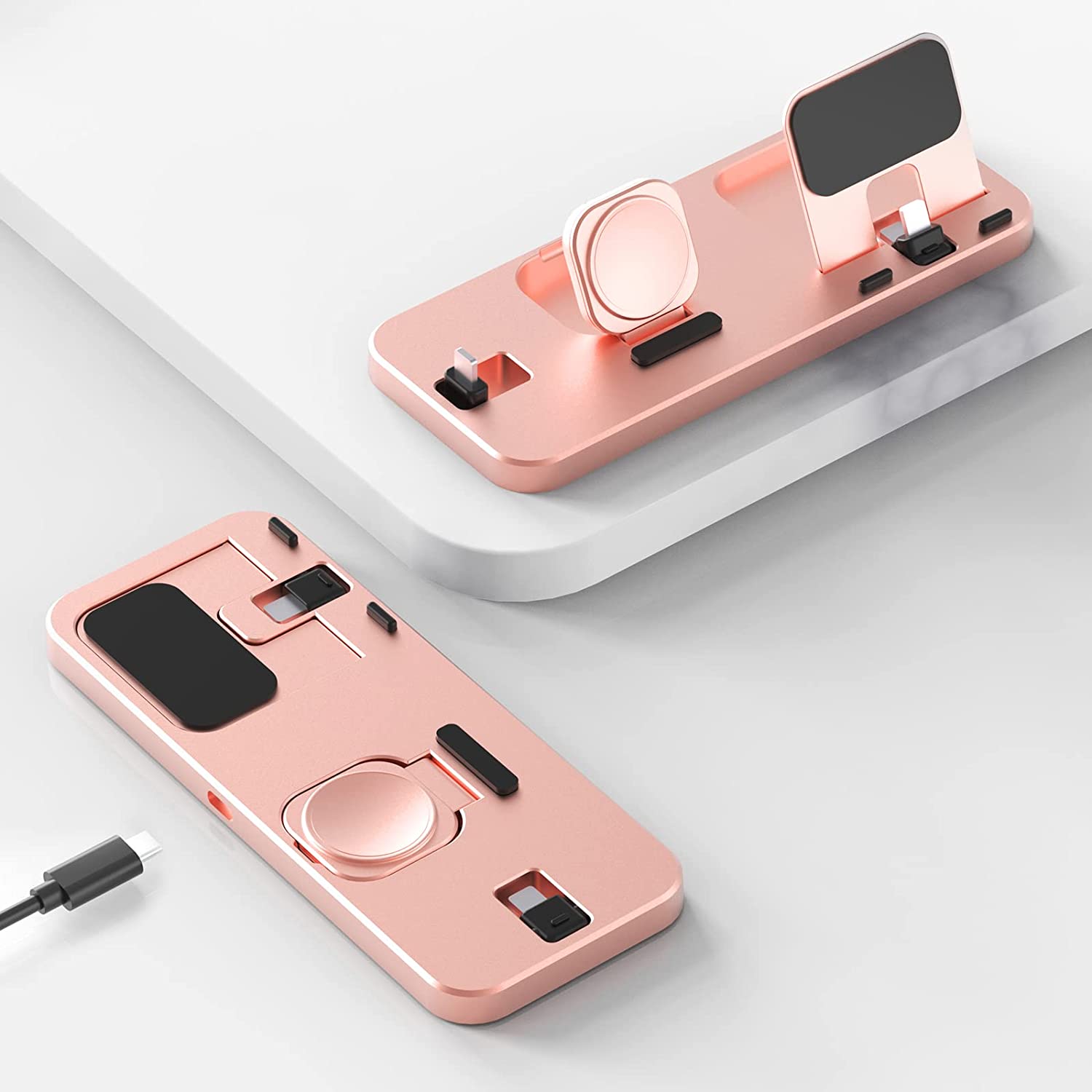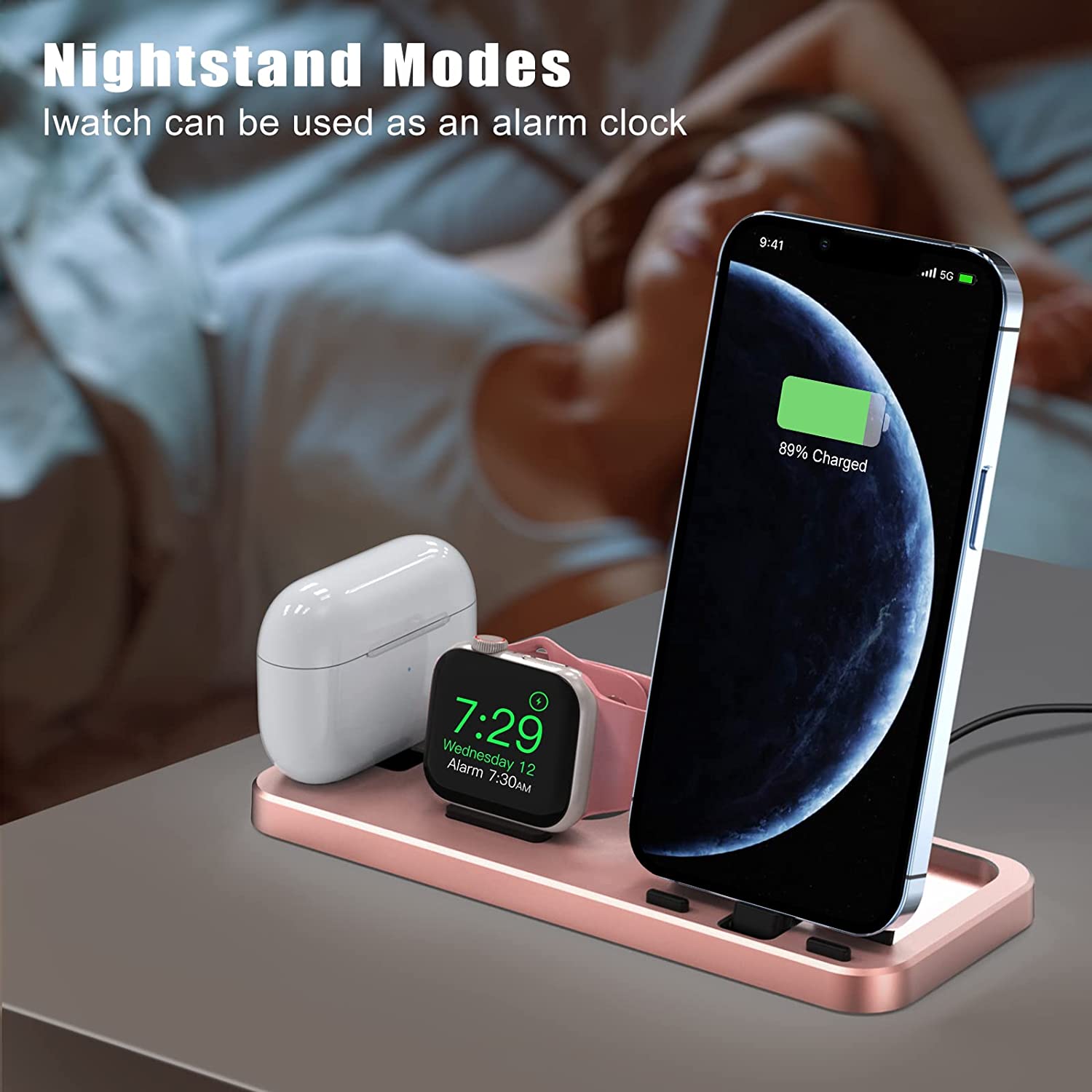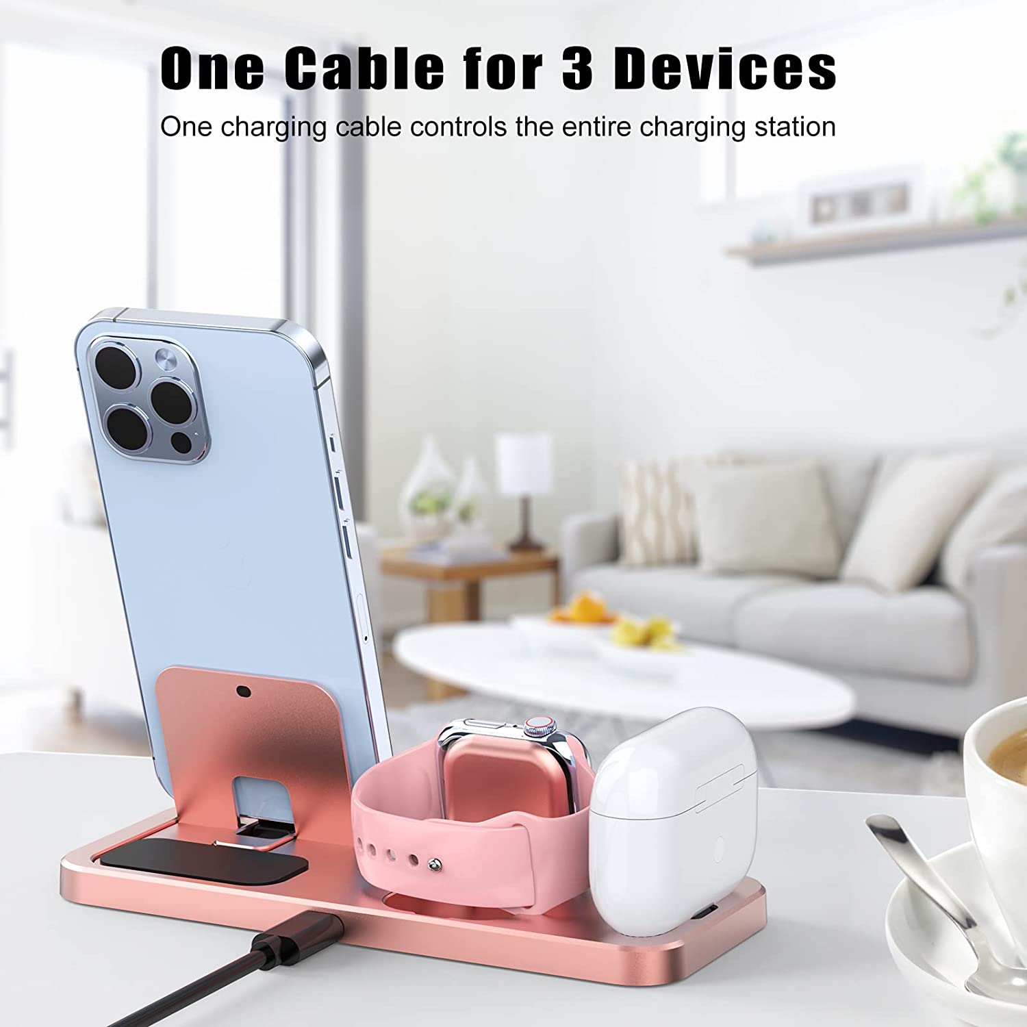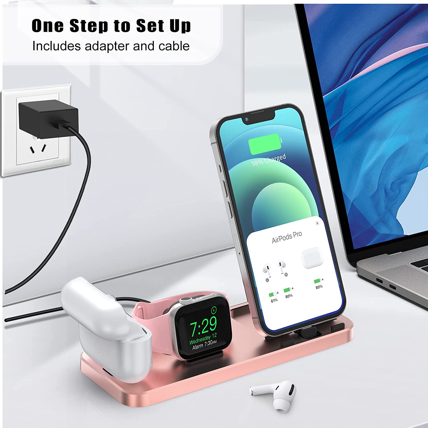3 in 1 Charging Station for Multiple Devices Apple Portable Charging Stand for Apple Watch iPhone and AirPods Build-in Charger Charging Dock Holder for iPhone with Adapter and Cable (Rose Gold)