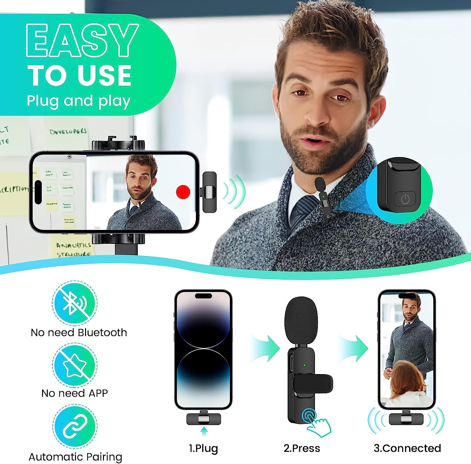 • Applications: This innovative dual wireless lavalier microphone is compatible with IOS smartphones, iPad, etc. The handheld microphone is suitable for blogging, interviewing, live streaming, blogging, podcasting, YouTube, Instagram, TikTok, online video tutorials and singing recording. Ideal for bloggers, journalists, Mukbang, fitness instructors, teachers and office workers. Bluetooth microphone for Apple phones, the clip-on microphone is very lightweight and easy to carry.