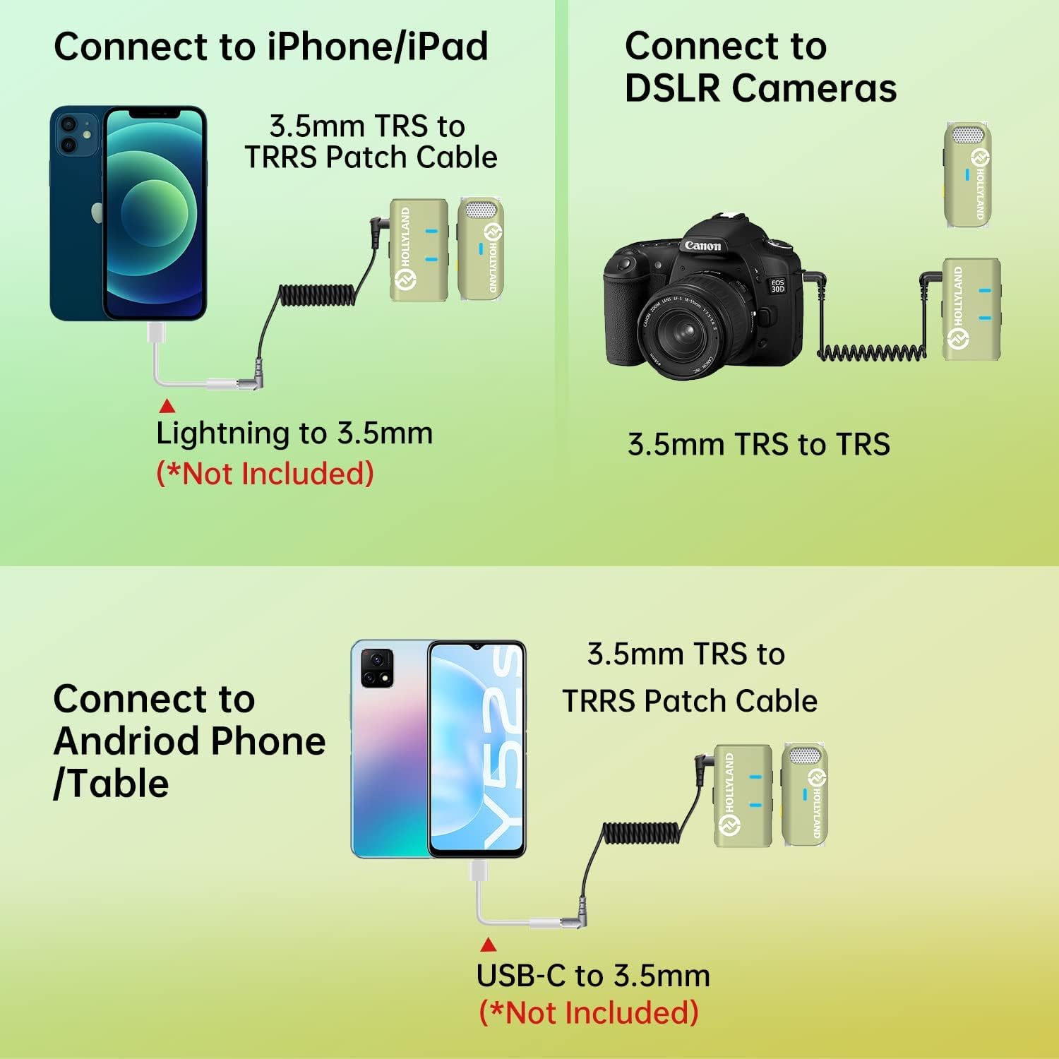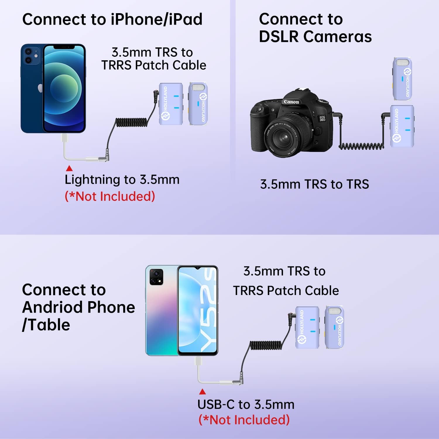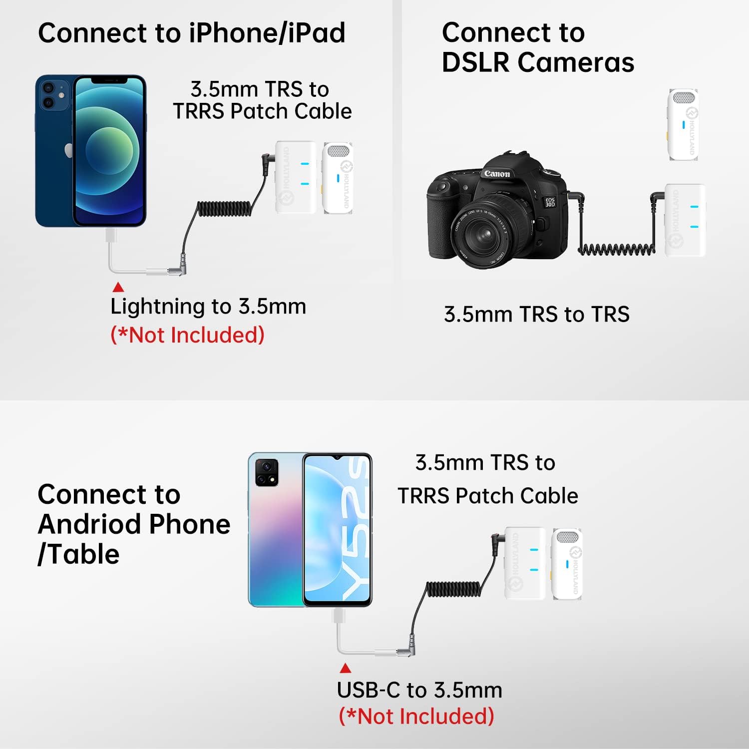 • Wide Compatibility. Lark M1 wireless lavalier mic works with all kinds of devices. Included a 3.5mm-TRS-to-TRS cable for all kinds of DSLR cameras, and a 3.5mm-TRS-to-TRRS cable for computers/phones with a 3.5mm port. (3.5mm-TRS-to-lightning cable for iPhone/iPad or 3.5mm-TRS-to-Type-C cable for Android phones was not included).