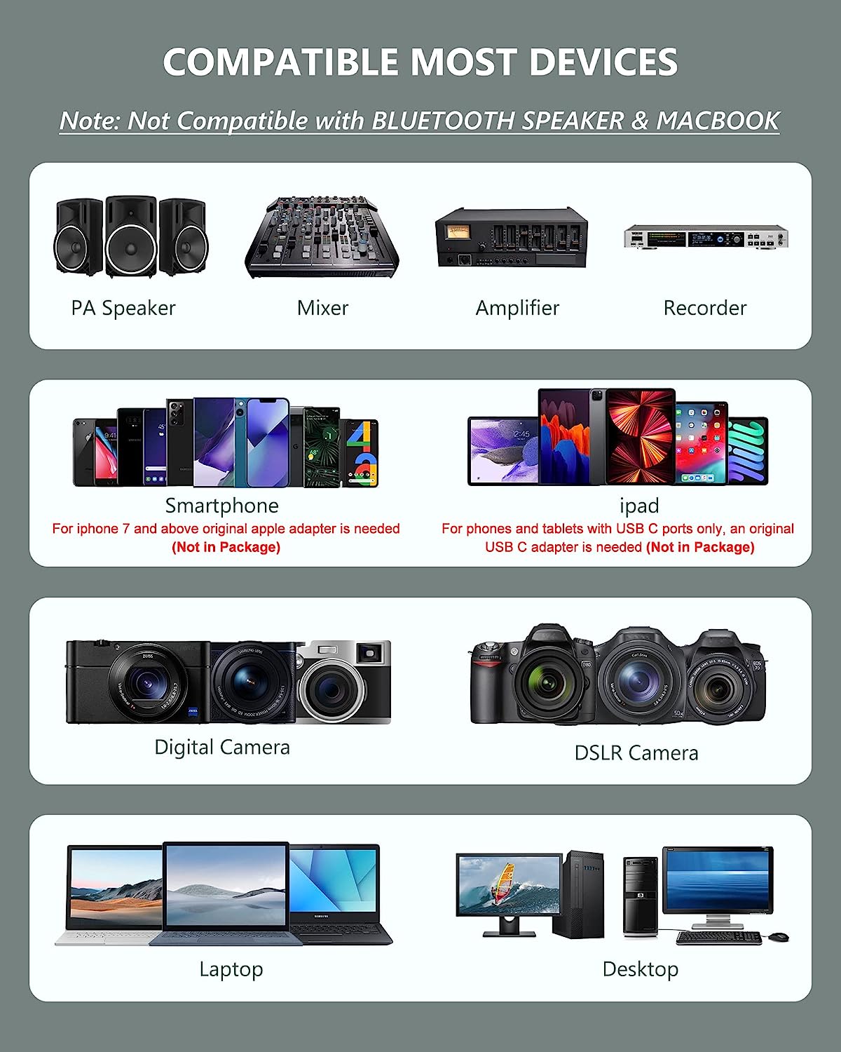 • Great Value Complete Accessories - This Microphone System is equipped with Three Adapter!!! (2 trs adapters & 1 trrs adapter); 3 Microphones: a.Headset Mic b.Handheld Mic c.Lavalier Lapel Mic. What’s more, You will get a Multifunctional Tripod, a Windproof Fur Shield, and a Charging Cable(save your time, no need to spend extra money to buy ).
