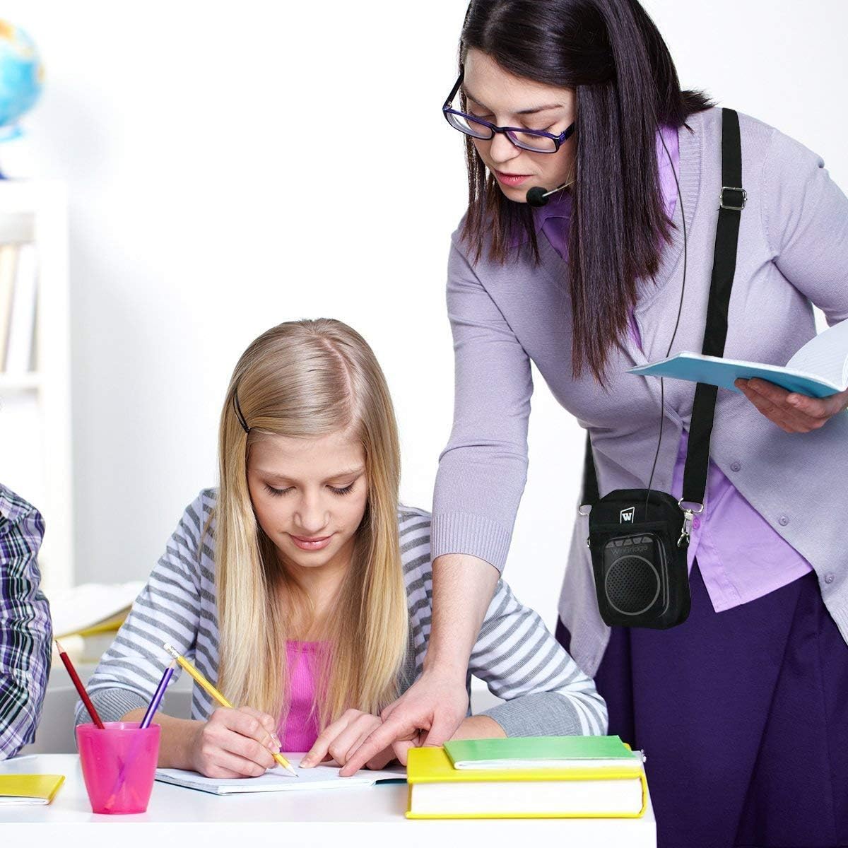 • Microphone and speaker compact size (7.087 x 5.669 x 2.205 inches) and light weight (11.36 ounces). Voice Amplification System comes with an adjustable band you can use around your waist but also has a clip on the back of the unit you can clip on a belt or pant waistband.