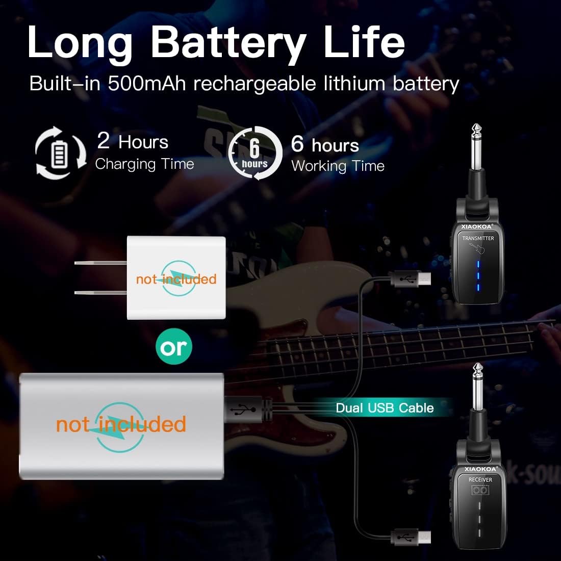 • 🎸【Widespread Use】280°rotatable plug design, available for most electric music instruments, electric guitar, bass and other musical instruments with pickup.🎸We also offer 3.5mm adapter (included)for the receiver to connect more Amplifier Equipment.