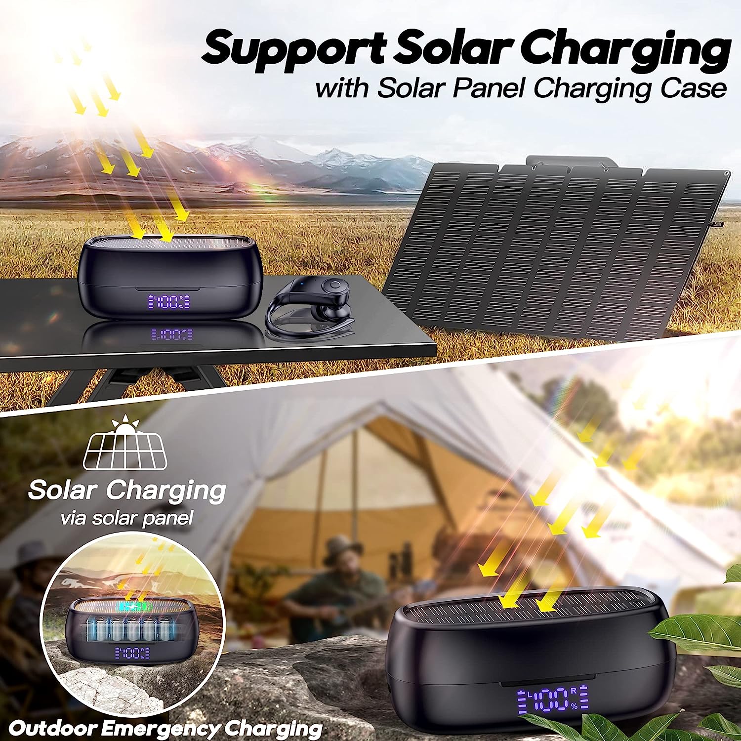• 【Support Wireless&Type-C Charging&Solar Charging】The charging case for headphones wireless bluetooth supports wireless and Type-C charging, which make charging more convenient.(USB-C cable included, charging adapter&wireless charging pad not included). Fully charge the charging case takes 3 hours via Type-C cable or about 6 hours via charging pad. With high performance monocrystalline silicon solar panels with excellent light transmission,this earphones support solar charging where there is sunlight. Perfect for outdoor sports, such as traveling, hiking, climbing, running, fishing, cycling, etc.