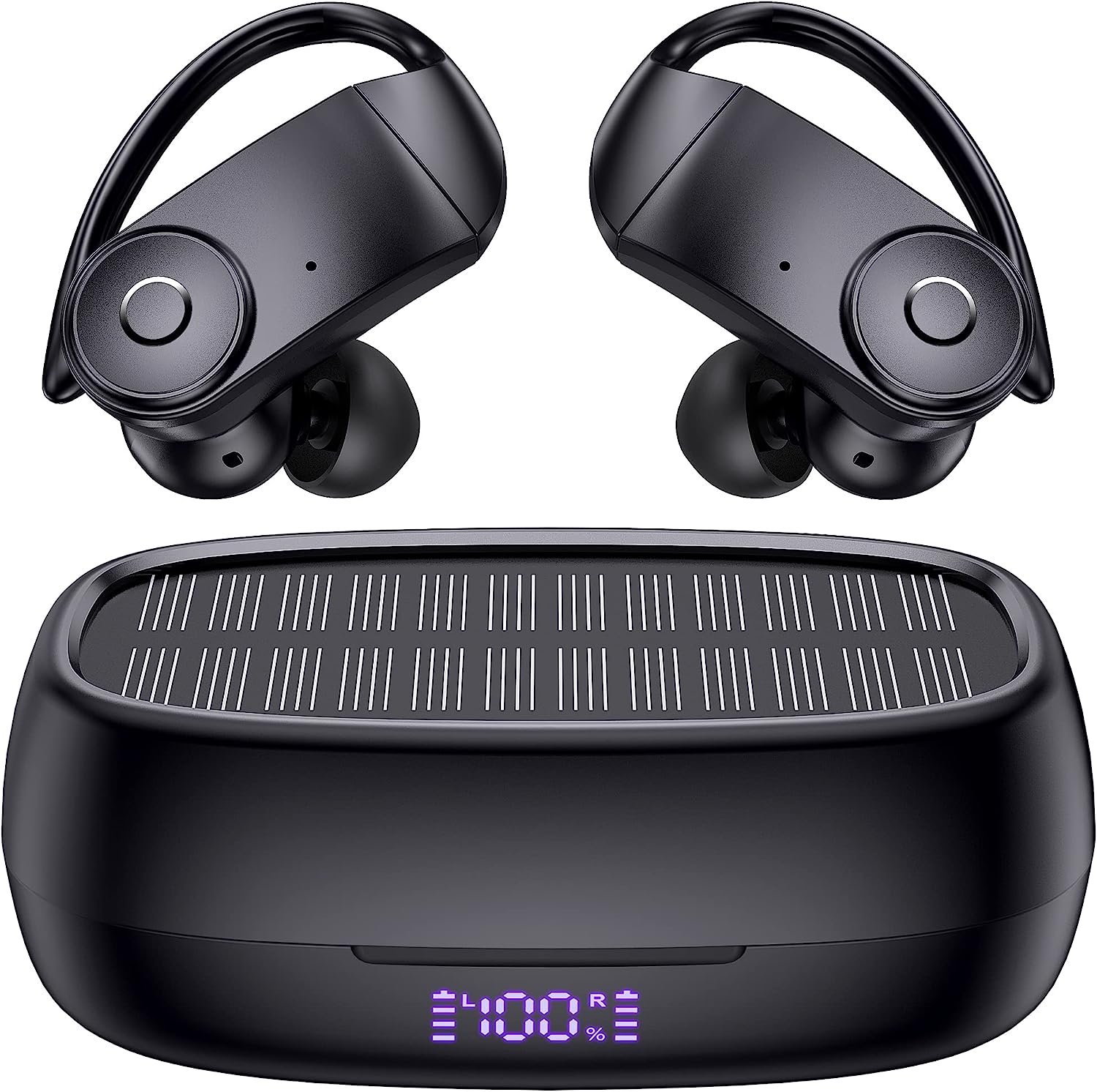 Wireless Earbuds Bluetooth Headphones with Earhooks[Solar Charging &Wireless Charging with LED Display][IPX7 Waterproof ]Wireless Over Ear Buds Built-in Mics Headset for Sport Running Workout-Black