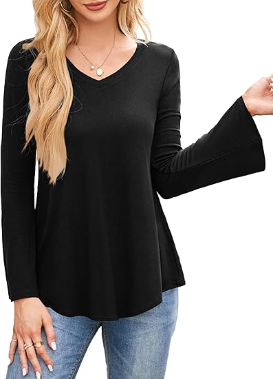 Amoretu Womens V Neck Tshirts Bell Long Sleeve Shirts Swing Tunic Tops