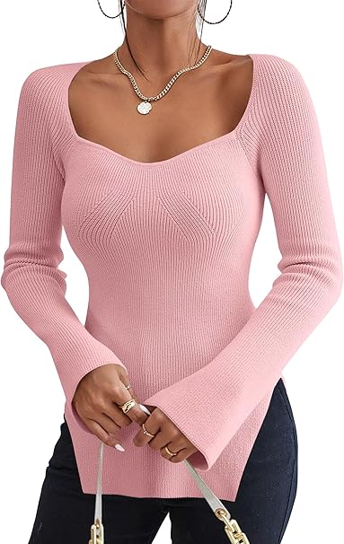 Aoysky Womens Square Neck Sexy Pullover Sweaters Ribbed Knit Long Bell Sleeve Slim Fit Split Stretch Jumper Tops