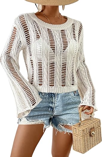 Bsubseach Fall Sweaters for Women 2024 Hollow Out Long Bell Sleeve Casual Crochet Pullover Knit Crop Tops Vacation Outfits