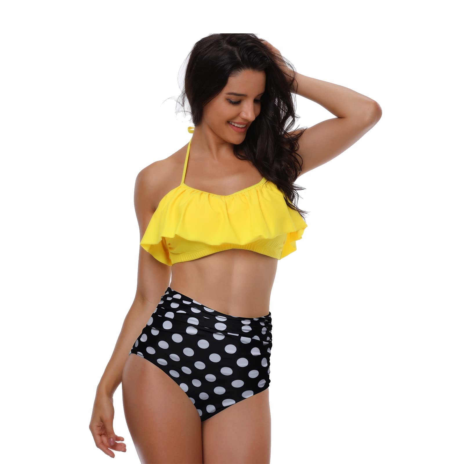 • 【Womens Swimsuits】: The women's bikini set features a stylish combination of a yellow bikini top with a halter design and padded chest, and a high-waisted bottom with black and white polka dots for a playful and flattering look.
