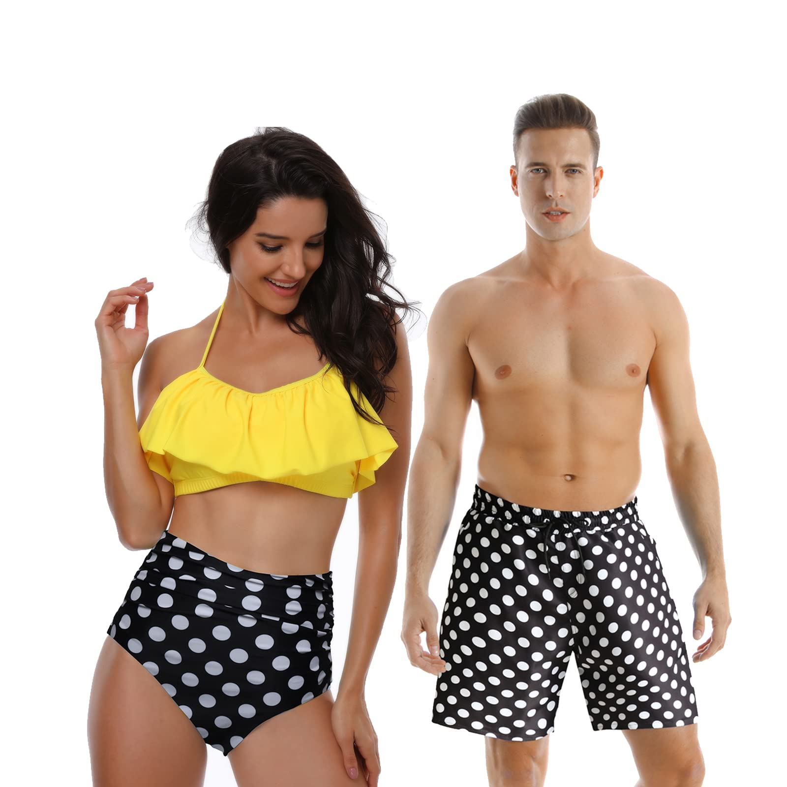 Ulikeey Polka Dots Couples Matching Swimsuit Women Bikini Set Yellow Top & High Waisted Bottom Men Swim Trunks with Linning