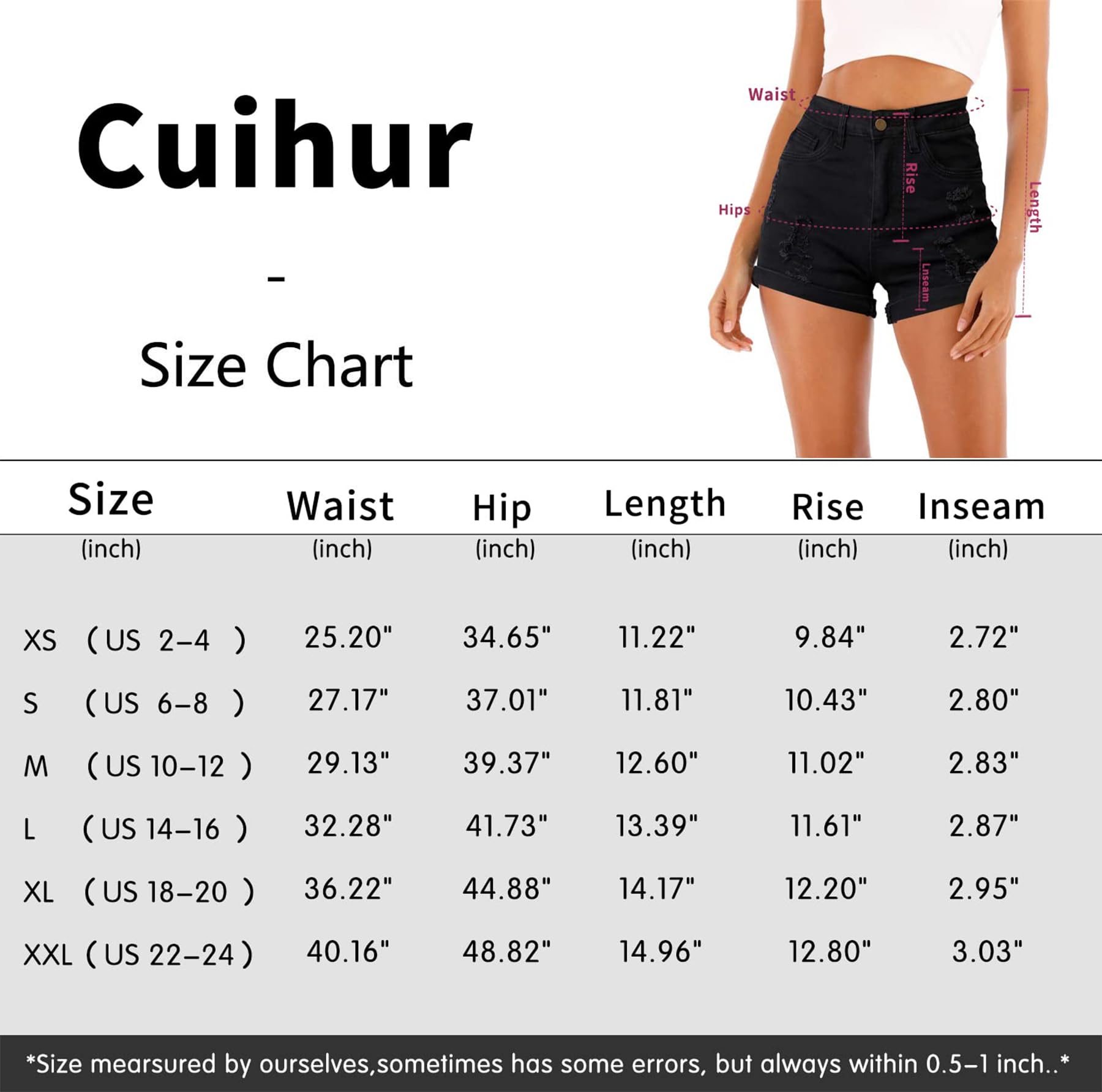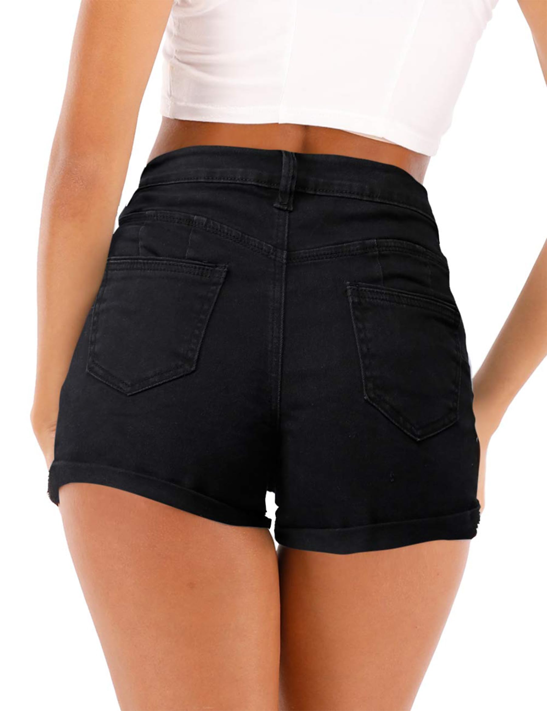 • This ripped jean shorts denim size:X-Small=US(2-4);Small=US(6-8);Medium=US(10-12);Large=US(14-16);X-Large=US(18-20);2X-Large=US(22-24) Please check Size Measurements before ordering to ensure a proper fit. Breathable and soft fabric, high waisted jean shorts for summer.