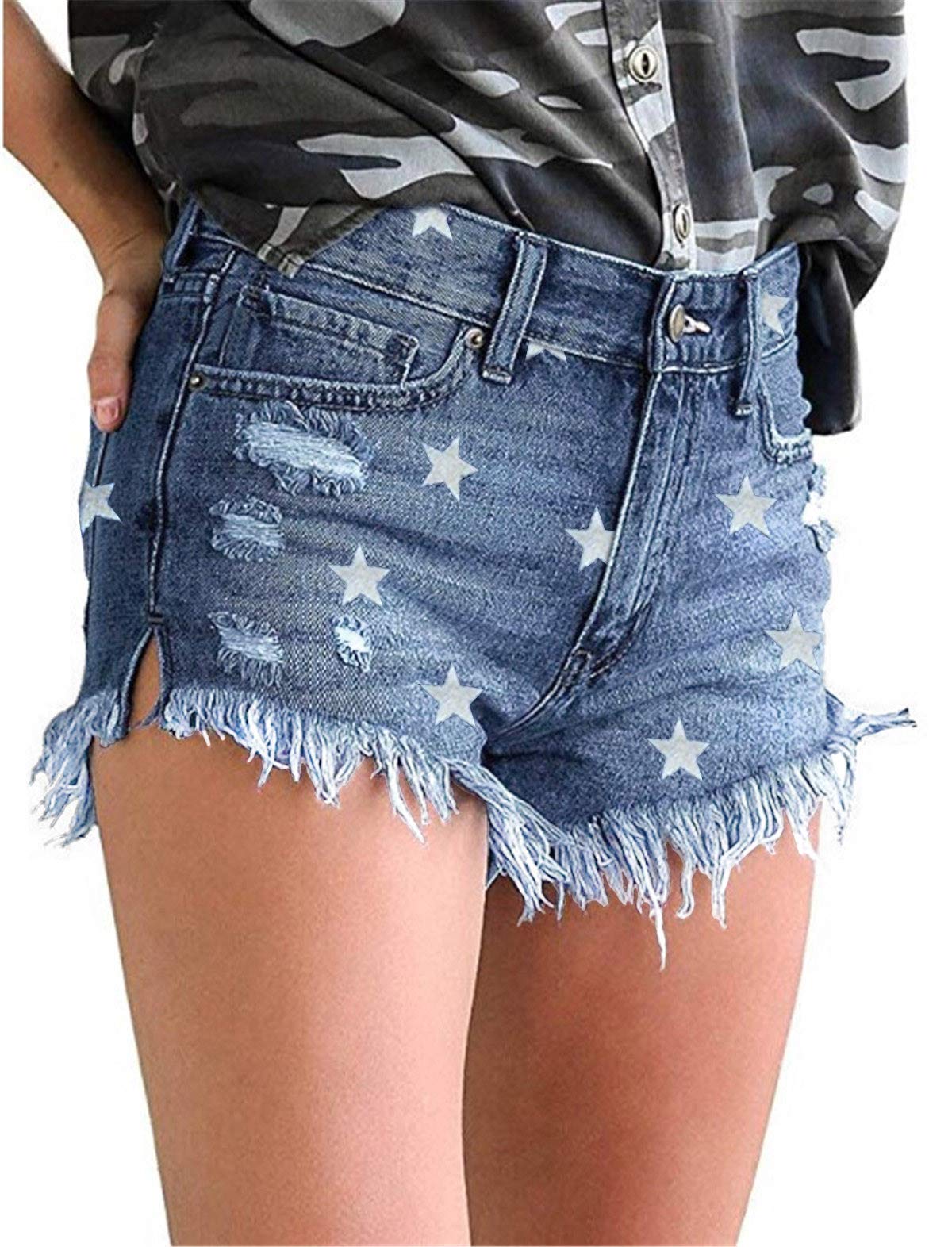 MODARANI Denim Short for Women Mid-Rise Jeans Junior Summer Frayed Hot Pants Star Print S