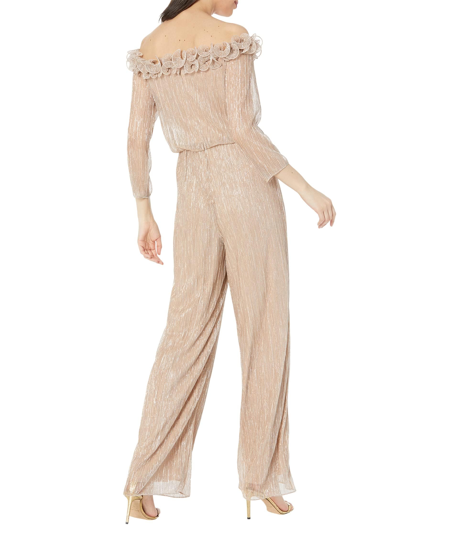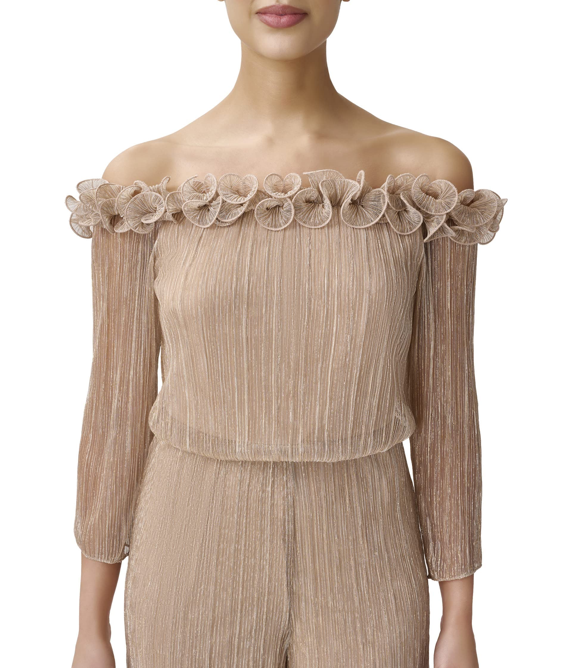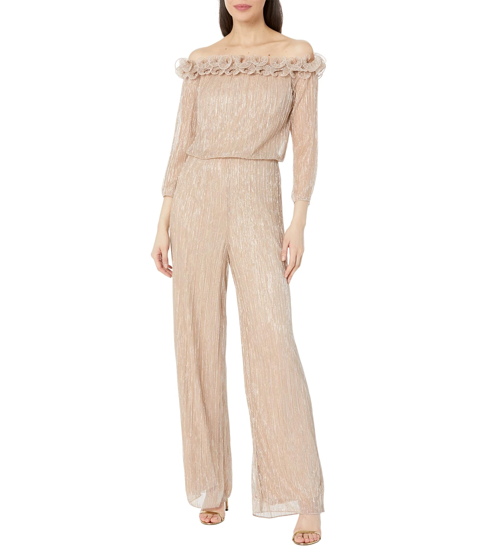 Details: Shimmer and shine all night long in our classic jumpsuit artfully updated with a row of feminine rosettes framing the neckline. We love the iconic blouson silhouette (so flattering) and sheer three-quarter sleeves. The relaxed-fit, wide-leg pants have a beautiful drape. A versatile style thats an elevated style everywhere you go.