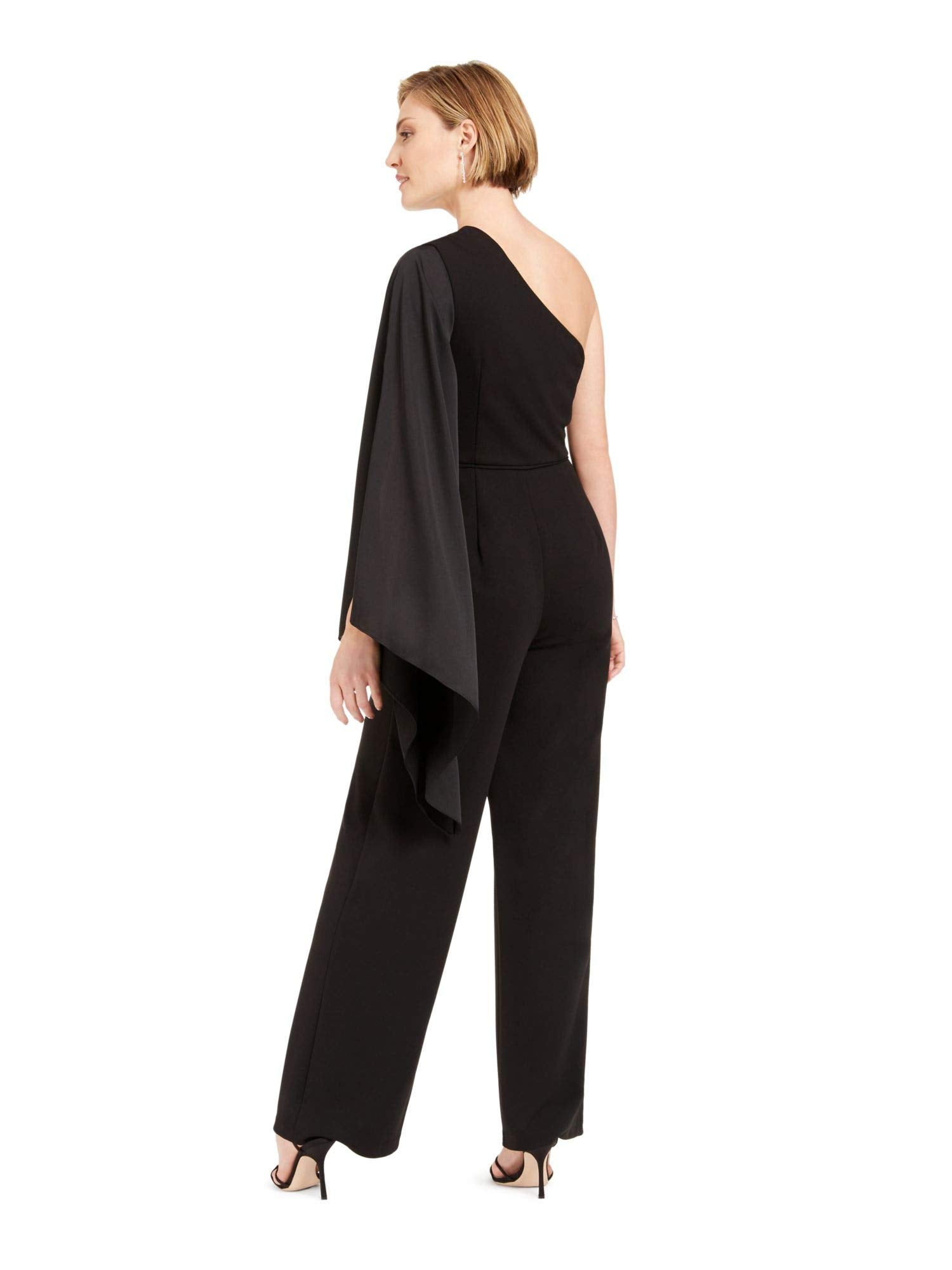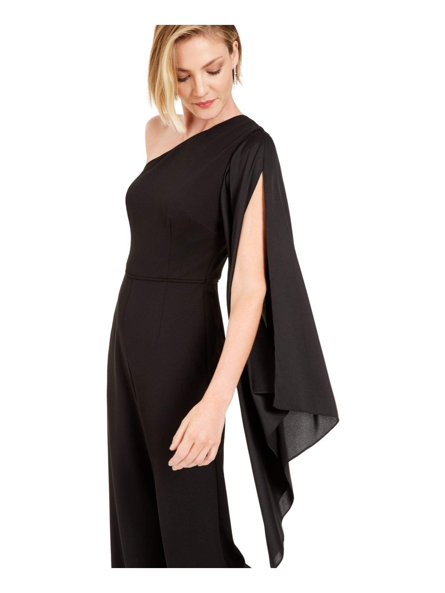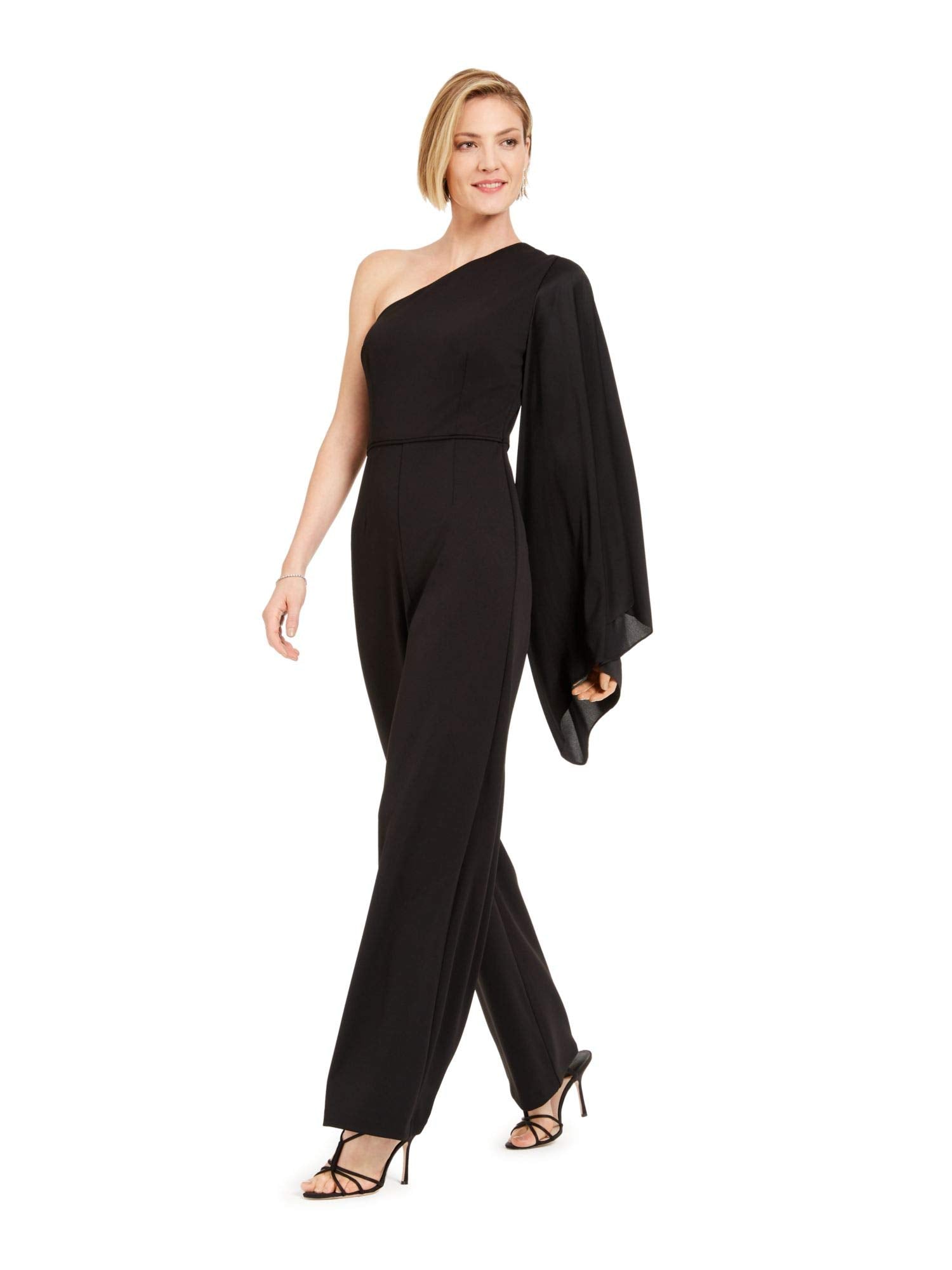 Details: This is a one shoulder crepe jumpsuit featuring a long split sleeve and wide leg pants
