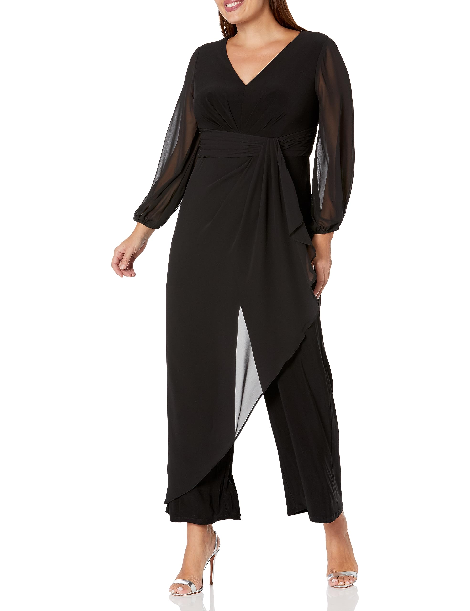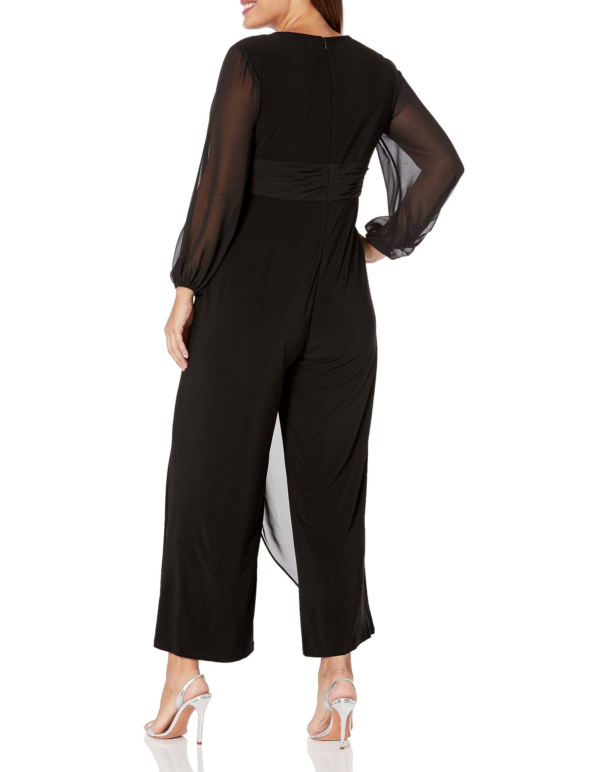 Details: Wherever youre headed, this long sleeve jumpsuit will be a go-to look. The jumpsuit features a fitted bodice with v-neckline and long bishop sleeves. The chiffon overlay showcases pleating at the bodice before cascading down the jumpsuits silhouette. This elegant jumpsuit has wide legpants and a zipper back. Crafted from jersey fabric, this jumpsuit is very stretchy and will be comfortable all day. Paired with open-toed heels and sparkling jewels for an evening event or a closed-toe pump for day, this dressy jumpsuit is an appropriate look for all of your events.