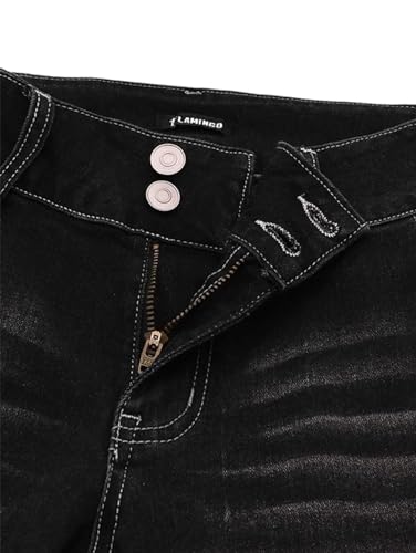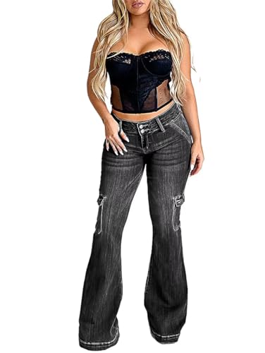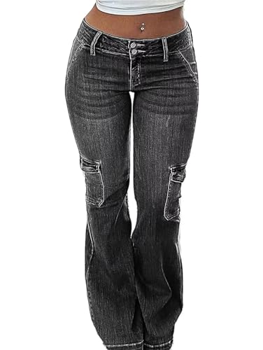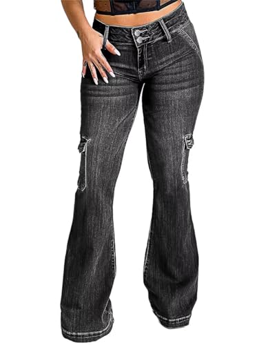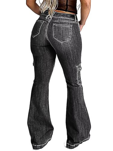 Flamingals Women's Flap Pocket Button Front Flare Jeans Mid Waist Casual Pants Black Wash M