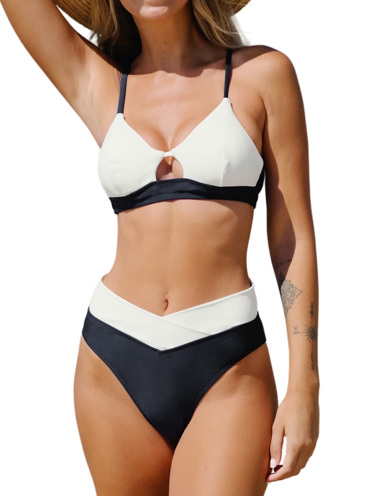 CUPSHE Women Bikini Sets Two Piece Swimsuits Colorblock Cutout Spaghetti Straps Back Tie Cheeky High Waisted Bikini Bottom M Black/White