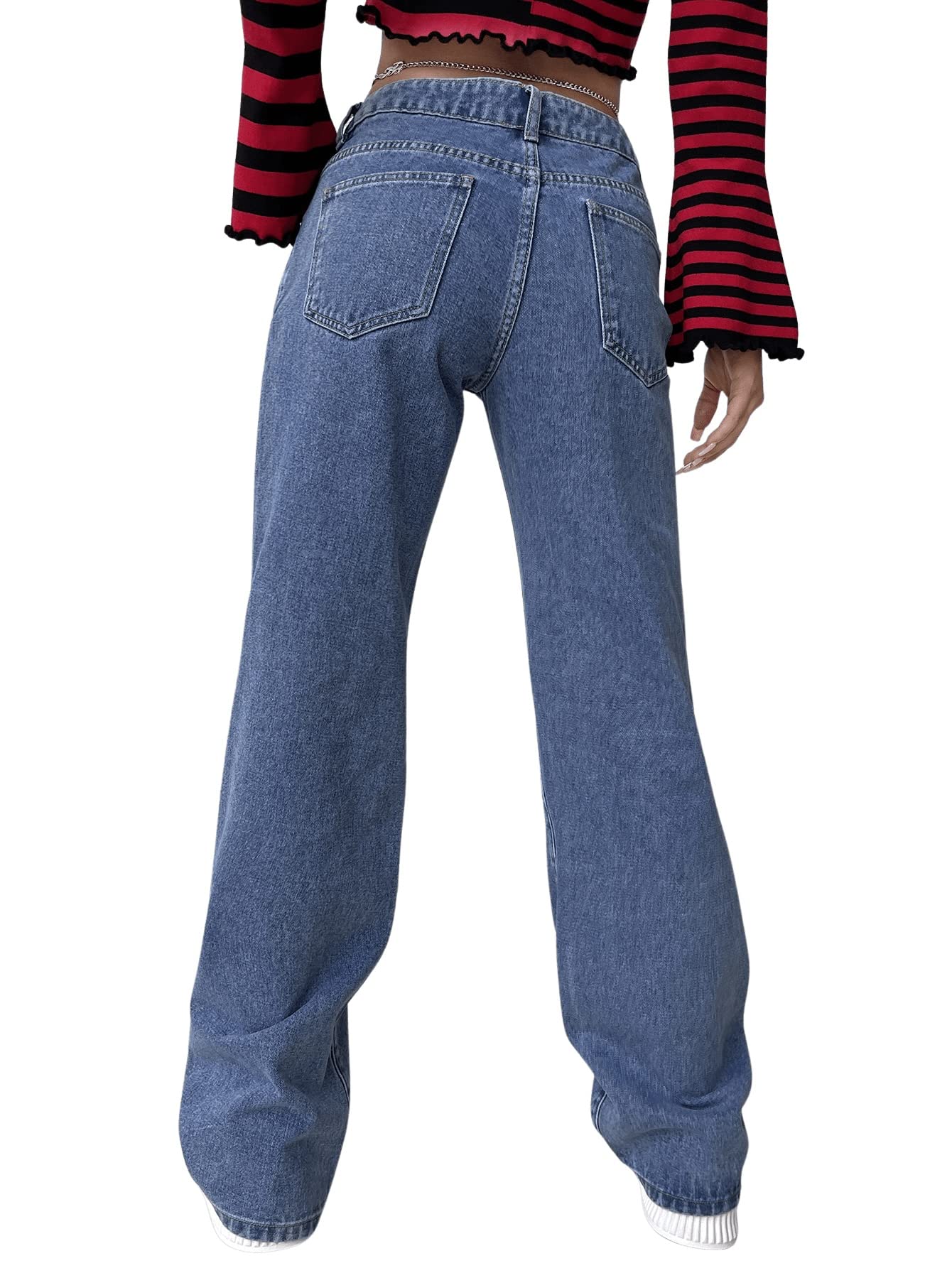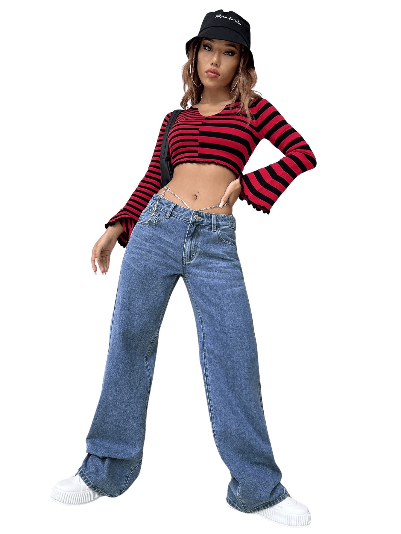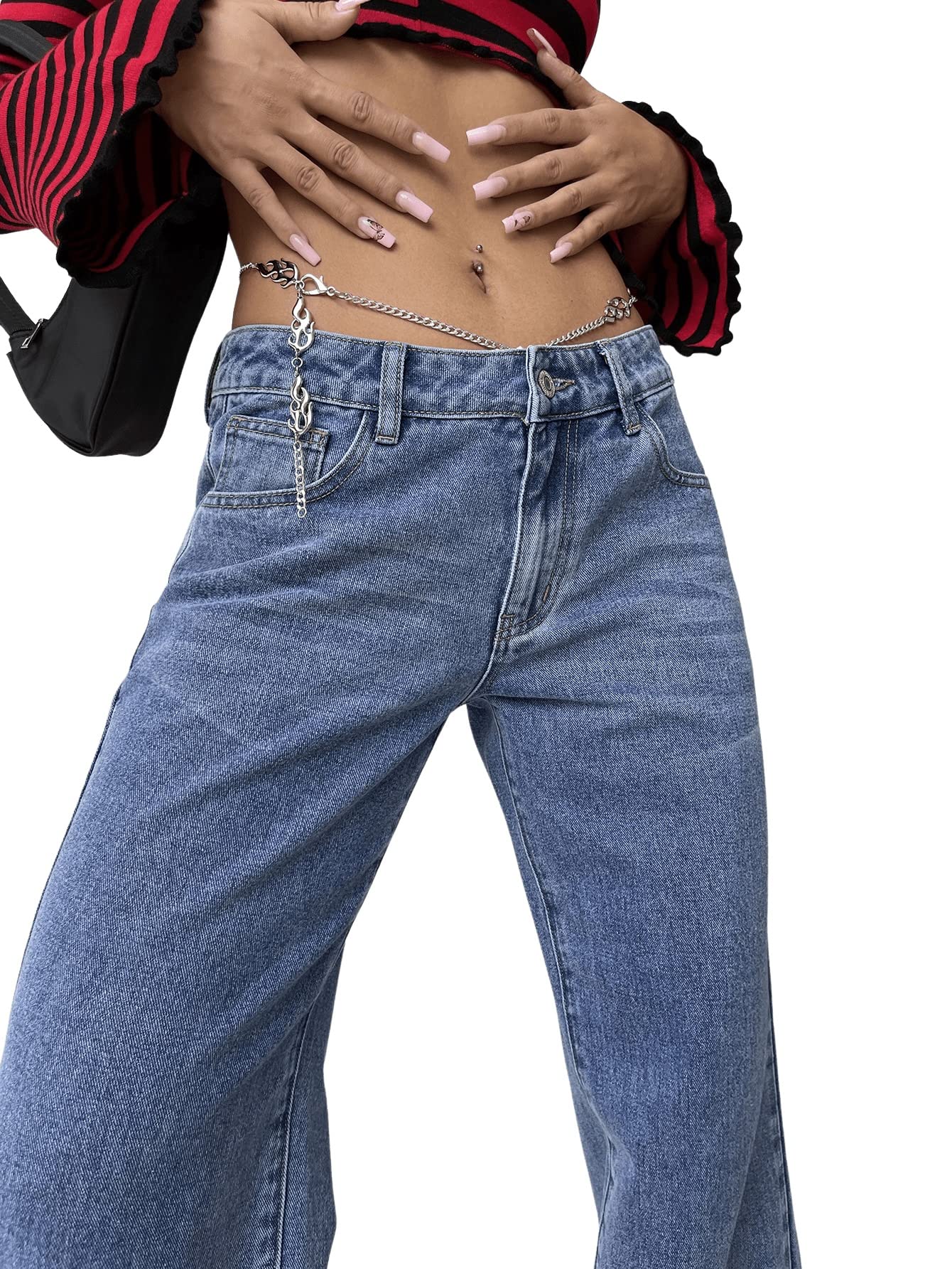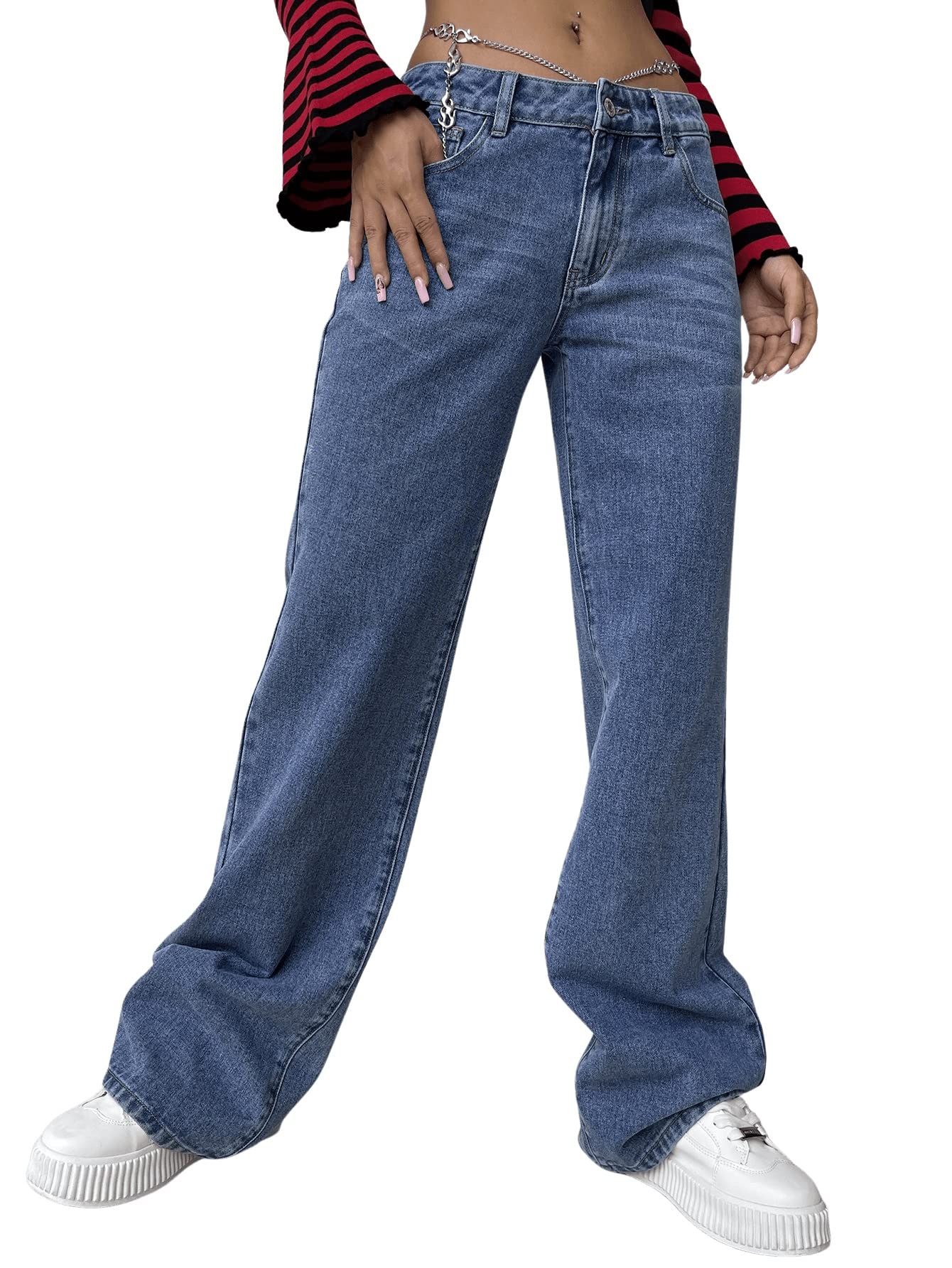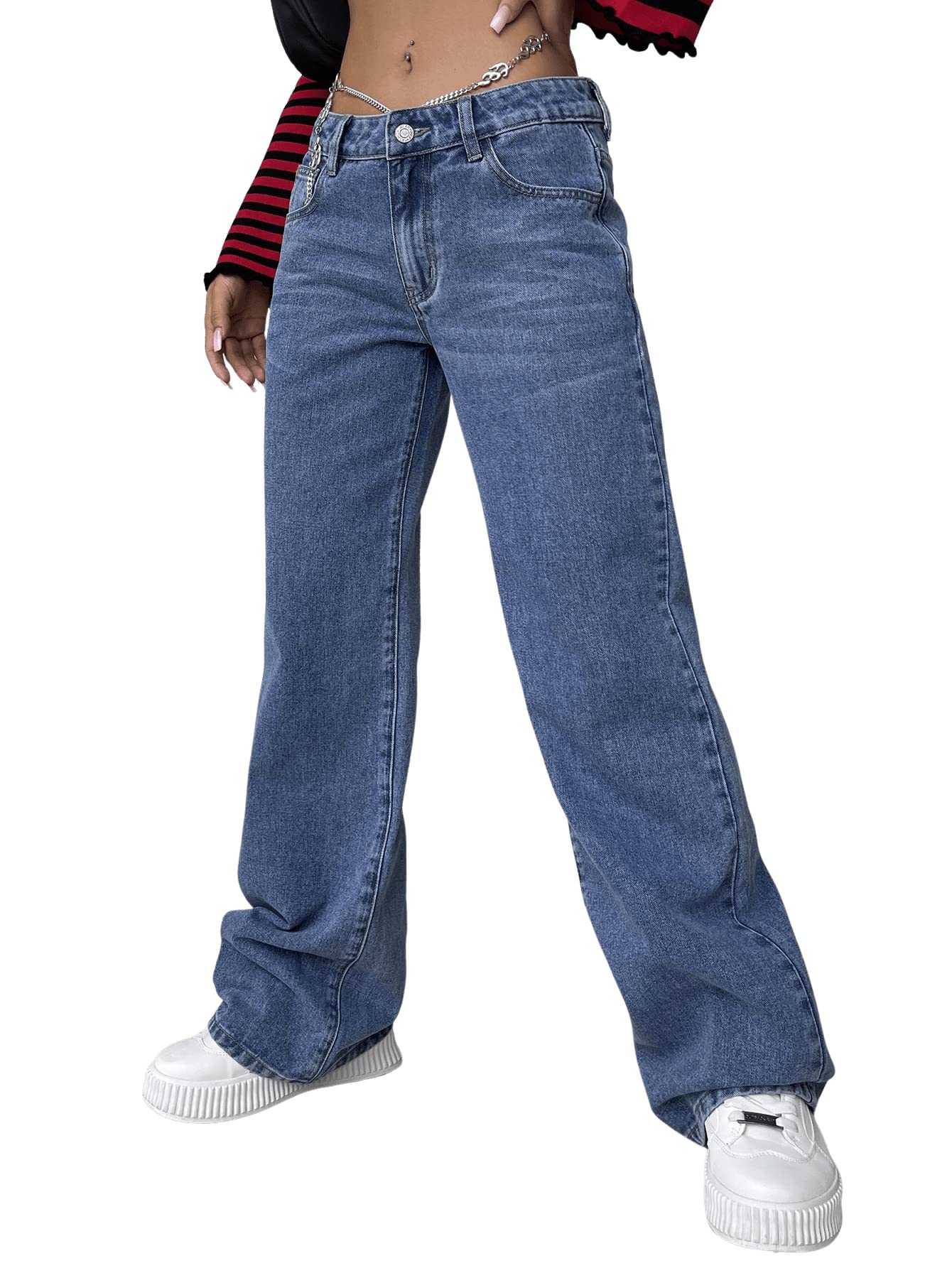 SweatyRocks Women's Casual Low Rise Wide Leg Jeans Chain Straight Leg Denim Pants with Pockets Medium Wash M